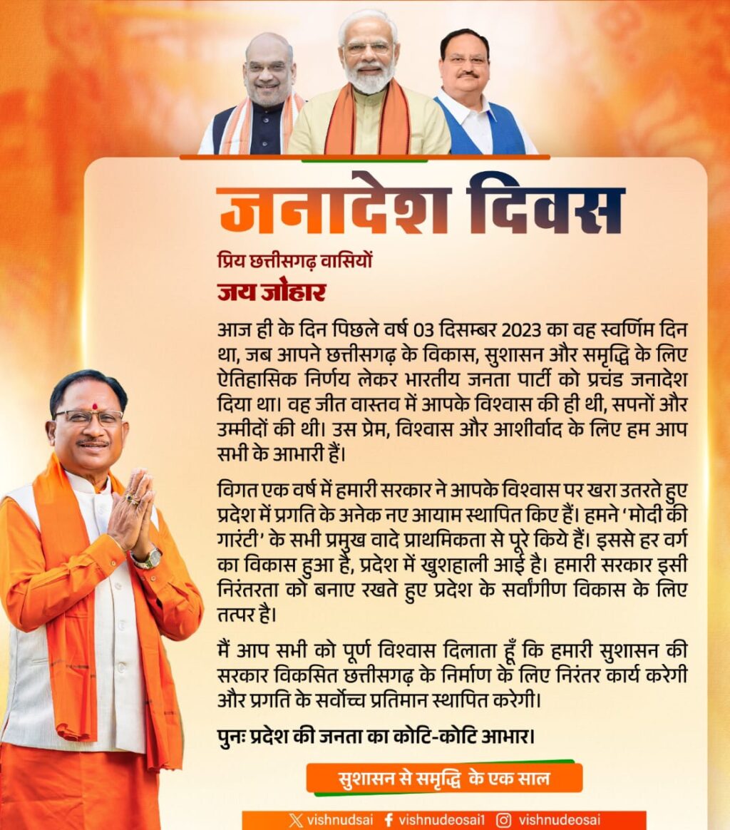 रायपुर। *आज ही के दिन पिछले वर्ष 03 दिसम्बर 2023 का वह स्वर्णिम दिन था, जब आपने...