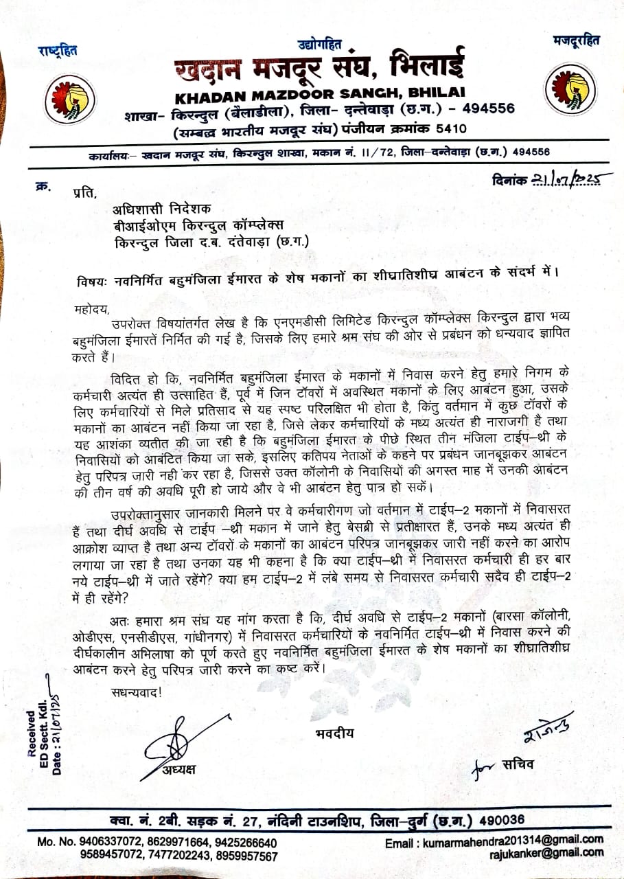 एस एच अज़हर दंतेवाड़ा किरंदुल: खदान मजदूर संघ (संबद्ध भारतीय मजदूर संघ), शाखा किरंदुल ने एनएमडीसी...