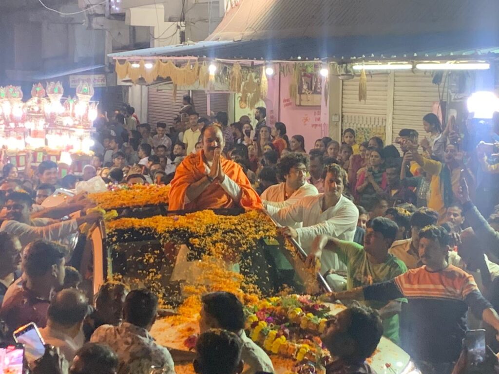 रायपुर में बुधवार से आयोजित चम्पेशवर शिव महापुराण कथा के अंतर्राष्ट्रीय कथाकार सीहोर वाले महाराज पंडित प्रदीप मिश्रा अपने टीम के साथ मंगलवार को रायपुर पहुंचे। माना एयरपोर्ट पर आयोजक परिवार और आयोजन समिति के सदस्यों ने महारज श्री का स्वागत अभिनंदन किया। एयरपोर्ट से रवाना होकर शिव महापुराण के आयोजक बसंत अग्रवाल और उनकी टीम महाराज श्री को साथ लेकर भारत माता चौक पहुंचे जहां हजारों की तादाद में उपस्थित भक्तजनों ने महाराज जी की एक झलक पाने के लिए बोल बम और हर हर महादेव के जयकारे लगाए।। सीहोर वाले महाराज की एक झलक पाने के लिए भक्त चार बजे से ही सड़कों पर उतर आए थे चारों ओर भक्तों का जमावडा लगा हुआ था।। भारत माता चौक से दहीहांडी मैदान तक भक्तों की भारी भीड़ रही इस बीच जगह जगह महाराज जी का स्वागत सत्कार भक्तों ने किया। घोड़े रथ और बाजा गाजा के साथ भक्तों का काफिला आगे बढ़ा। महाराज जी की एक झलक पाने के लिए भक्तगण पलके बिछाए हाथ जोड़कर अभिवादन कर रहे थे महाराज भी भक्तों के प्यार को देखते हुए अपनी गाड़ी से ऊपर खड़ा हो कर सभी का अभिवादन वंदन स्वीकार करते हुए आगे बढ़ते गए। महाराज जी को देखने के लिए भारी संख्या में भक्त पीछे साथ साथ चलते रहें और भारत माता चौक से कथा स्थल तक भक्तों की भारी भीड़ लगी रही ।इस दौरान भारत माता चौक पर महाराज के साथ समिति के प्रमुख चंदन बसंत अग्रवाल, संसदीय सचिव विकास उपाध्याय और आयोजन समिति के सदस्य उनके साथ चलते नजर आए।