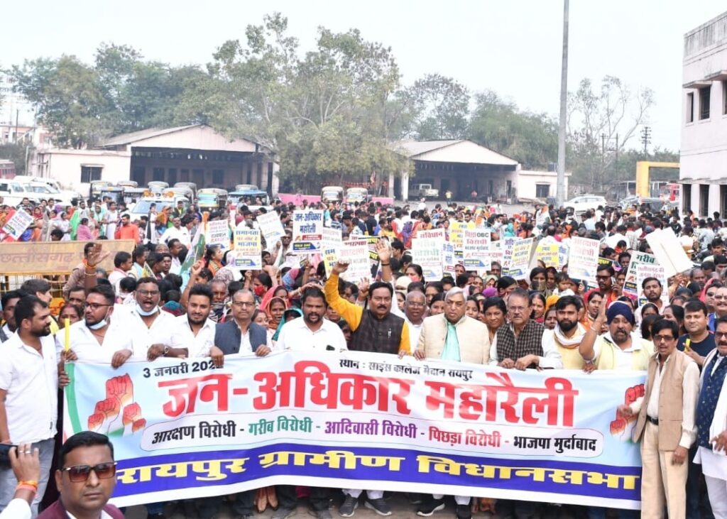 रायपुर । भाजपा की आरक्षण विरोधी नीतियों के खिलाफ कांग्रेस पार्टी ने राजधानी रायपुर के सांइस कॉलेज मैदान में जन अधिकार महारैली का आयोजन कर भाजपा को आरक्षण पर राजनीति करने का आरोप लगाते हुए जमकर कोसा । इस मौके पर सभा को संबोधित करते हुए कांग्रेस की छत्तीसगढ़ प्रभारी कुमारी शैलजा ने कहा कि एक मकसद मन में तय करके एक पहल जो यहाँ पर हुई।