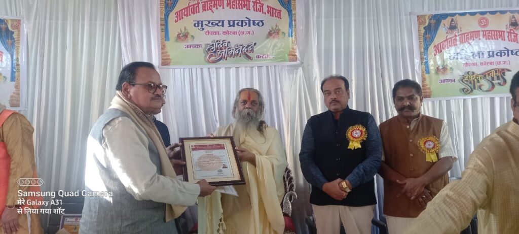 रायपुर । हमारे पूर्वज संपूर्ण समाज की सुख, समृद्धि एवं शांति की कामना करते हुए आए हैं हम सभी को भी इसी परंपरा और परिपाटी को आगे बढ़ाना है। हम सर्वे भवंतु सुखिनः सर्वे संतु निरामया। के सिद्धांत पर कार्य करते हैं यह बातें छत्तीसगढ़ राज्य गौ सेवा आयोग के अध्यक्ष राजेश्री महन्त रामसुन्दर दास जी महाराज ने आर्यावर्त ब्राह्मण महासभा द्वारा आयोजित नियुक्ति पत्र वितरण समारोह में मुख्य अतिथि की आसंदी से अभिव्यक्त किया। उल्लेखनीय है कि परशुराम भवन ऊर्जानगर गेवरा, दीपका, कोरबा में यह कार्यक्रम आयोजित किया गया था। कार्यक्रम स्थल पर पहुंचने पर आयोजक मंडली के द्वारा उनका भव्य स्वागत किया गया। कार्यक्रम का शुभारंभ भगवान राघवेंद्र सरकार की तैल चित्र पर दीप प्रज्वलन के साथ हुआ। स्वागत गान के उपरांत समाज के प्रतिष्ठित लोगों को विभिन्न पदों पर नियुक्ति पत्र प्रदान किया गया। इस अवसर पर अपना आशीर्वचन प्रस्तुत करते हुए राजेश्री महन्त जी महाराज ने कहा कि शास्त्रों में ब्राह्मण, पक्षी तथा दांत को द्विज कहा गया है। जनेऊ संस्कार के द्वारा ब्राह्मणत्व की प्राप्ति होती है। हमें अपनी संस्कृति का ध्यान निरंतर रखना चाहिए। चाणक्य ने नंद वंश की समाप्ति के लिए अपनी सीखा पकड़ कर संकल्प लिया था, वर्तमान में ब्राह्मणों ने शिखर रखना ही बंद कर दिया है, प्रत्येक ब्राह्मण को सीखा, तिलक, जनेऊ अवश्य धारण करनी चाहिए। समाज ने जिन लोगों को विभिन्न पदों पर प्रतिष्ठित किया है उन्हें अपने पद की गरिमा के अनुरूप कार्य करनी चाहिए। उन सब की जिम्मेदारी समाज के प्रति और अधिक बढ़ गई है। उन्होंने कहा कि मैं कुछ अधिक समय तक आप लोगों के बीच में रहता और आप लोगों की भी बातों को सुनता लेकिन धार्मिक बाध्यता के कारण मकर संक्रांति के अवसर पर मुझे श्री दूधाधारी मठ एवं श्री जैतू साव मठ में भी उपस्थित होना है इसलिए आप सबसे विदा चाहूंगा। कार्यक्रम में विशेष रूप से श्री रमेश कुमार शर्मा, बजरंग शर्मा, सौरभ पांडे, श्रीमती रेखा त्रिपाठी, रेखेंद्र तिवारी, अंबरीश शुक्ला, राकेश तिवारी, श्रीमती शिल्पी तिवारी, श्री वेदांत चतुर्वेदी, दिलीप चतुर्वेदी, श्रीमती रागिनी पांडे, सहित आर्यवर्त ब्राह्मण महासभा के अनेक पदाधिकारी एवं कार्यकर्ता गण, मीडिया प्रभारी निर्मल दास वैष्णव तथा पुलिस प्रशासन के लोग उपस्थित थे।
