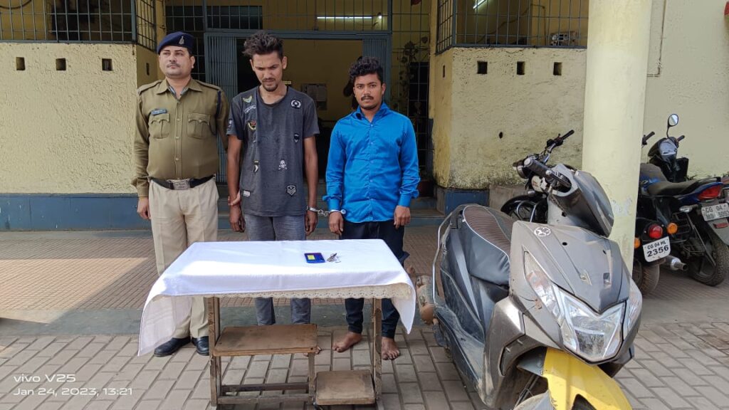 16.01.2023 की शाम करीबन 05.30 बजे प्रार्थी दीपक साहू निवासी सुभाष चौक ,बीरगांव से पैदल मोबाईल से बात करते हुये च्वाईस सेंटर जा रहा था कि गुप्ता होटल के पास पीछे से स्कूटी में दो अज्ञात लड़के प्रार्थी के मोबाईल को झप्पट्टा मारकर लूट कर भाग गये। प्रार्थी के द्वारा आरोपियों को पीछा किया किन्तु वे लोग भागने में सफल हो गये। प्रार्थी की रिपोर्ट पर थाना उरला में अप.क्र.40/23 धारा 392 भादवि का मामला पंजीबद्ध कर आरोपी पता तलाश शुरू किया गया । प्रार्थी से मोबाईल लूटने वाले आरोपियों के संबंध आवश्यक जानकारी प्राप्त कर बताये हुलिये एवं स्कुटी के संबंध में जानकारी लेकर पतातलाश करते हुये दो व्यक्तियों को चिन्हित कर थाना लाया गया और गहन पूछताछ उन्होंने लूट की वारदात करना स्वीकार किये और दोनों आरोपियों से लूटे गये मोबाईल एवं घटना मंे प्रयुक्त स्कूटी वाहन कीमती 35000/-रू बरामद किया गया। आरोपियों को विधिवत गिरफ्तार कर आज दिनाॅंक 24.01.2023 को न्यायिक रिमाण्ड पर भेजा जा रहा है।
