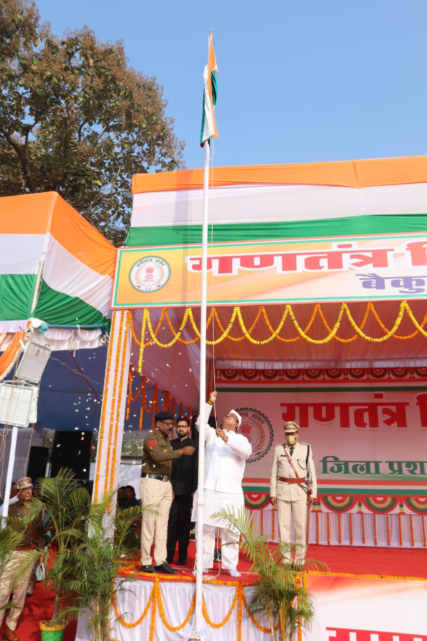शासकीय आदर्श रामानुज उच्चतर माध्यमिक विद्यालय के मिनी स्टेडियम में आयोजित गणतंत्र दिवस के मुख्य समारोह में राजस्व एवं आपदा प्रबंधन, पुनर्वास, वाणिज्यिक कर (पंजीयन तथा मुद्रांक) मंत्री श्री जयसिंह अग्रवाल ने मुख्य अतिथि की आसंदी से ध्वजारोहण कर परेड की सलामी ली। इसके बाद उन्होंने तिरंगे के प्रतीक रंग बिरंगे गुब्बारे एवं श्वेत कपोत आकाश में छोड़े।