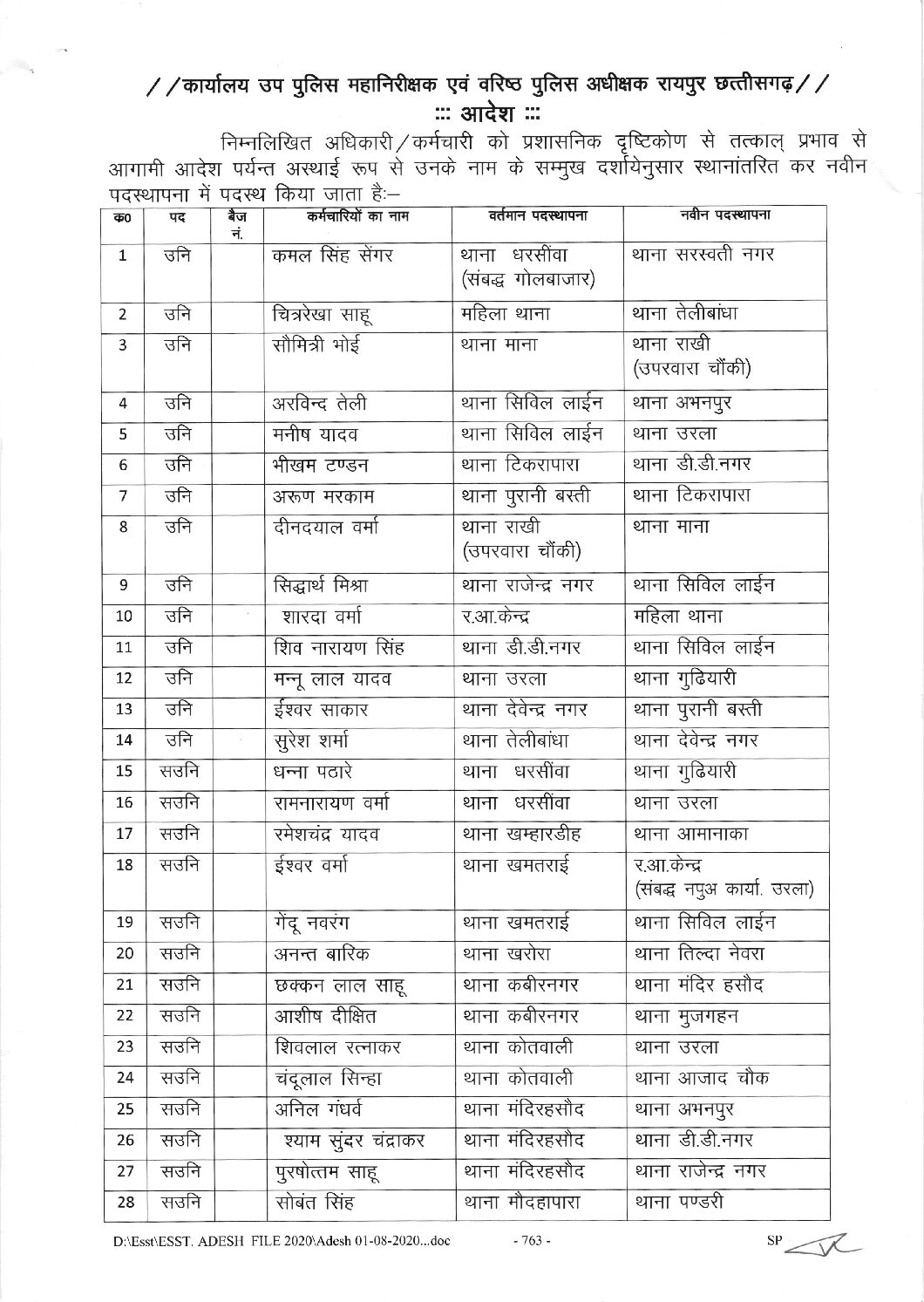 रायपुर। राजधानी में देर शाम एसएसपी प्रशांत अग्रवाल ने बड़े पैमाने पर एसआई, एएसआई और प्रधान आरक्षकों समेत कई आरक्षकों का तबदला किया है.