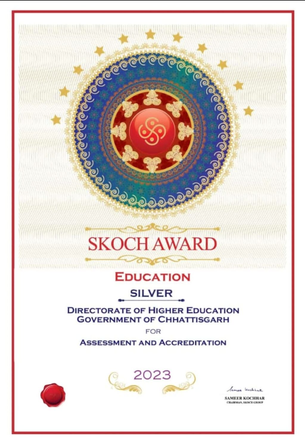 रायपुर 08 मई 2023/ उच्च शिक्षा विभाग को छत्तीसगढ़ के ‘‘प्रोजेक्ट असेसमेंट एंड एक्रेडिटेशन‘‘ को देश की प्रतिष्ठित स्कॉच सिल्वर अवार्ड प्रदान किया गया है। विभाग को यह अवार्ड देश के कई बड़े एवं महत्वपूर्ण प्रोजेक्ट के साथ प्रतियोगिता करते हुए कई चरणों की प्रस्तुतिकरण, वोटिंग एवं उपलब्धियों के कारण प्रदान किया गया है। इस उपलब्धि के लिए मुख्यमंत्री भूपेश बघेल और उच्च शिक्षा मंत्री श्री उमेश पटेल ने विभाग के अधिकारियों को कर्मचारियों को बधाई और शुभकामनाएं दी है।