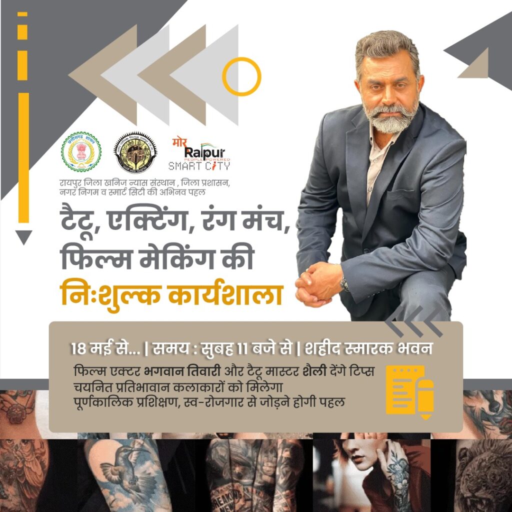 *रायपुर।* सिने एक्टर भगवान तिवारी और टैटू मास्टर शैली रायपुर में जिला खनिज न्यास संस्थान की पहल पर गुरूवार से आयोजित दो दिवसीय कार्यशाला में टैटू (गोदना) कला, एक्टिंग, रंग मंच, फिल्म मेकिंग, स्क्रिप्ट राइटिंग जैसी कला विधाओं का प्रशिक्षण देंगे। इस निःशुल्क वर्कशॉप में तृतीय लिंग समुदाय सहित विभिन्न आयु वर्ग के महिला, पुरूष व तृतीय लिंग समुदाय के सदस्य शामिल हो सकेंगे। रंगमंच संबंधी विधाओं में 10 वर्ष से अधिक आयु वर्ग के बच्चे शामिल होकर अपनी कला कौशल को संवारने का गुर विशेषज्ञों से सीखेंगे। कार्यशाला का आयोजन शहीद स्मारक भवन, रजबंधा मैदान में 18 मई को सुबह 11 बजे से शुरू होगा, जहां इन विधाओं में रूचि रखने वाले नवोदित कलाकार अपना पंजीयन करा सकेंगे।