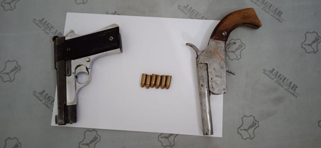 इसी तारतम्य में 15.05.2022 को एण्टी क्राईम एवं साईबर यूनिट की टीम को सूचना प्राप्त हुई कि थाना धरसींवा क्षेत्रांतर्गत तिवरैय्या ओव्हरब्रीज के पास एक व्यक्ति अपने पास पिस्टल एवं कट्टा रखा है तथा बिक्री करने हेतु ग्राहक की तलाश कर रहा है। जिस पर अतिरिक्त पुलिस अधीक्षक शहर/अपराध अभिषेक माहेश्वरी, नगर पुलिस अधीक्षक उरला अविनाश मिश्रा एवं उप पुलिस अधीक्षक क्राईम दिनेश सिन्हा द्वारा प्रभारी एण्टी क्राईम एवं साईबर यूनिट तथा थाना प्रभारी धरसींवा को आरोपी को हथियार के साथ रंगे हाथ गिरफ्तार करने हेतु निर्देशित किया गया। जिस पर एण्टी क्राईम एण्ड साईबर यूनिट तथा थाना धरसींवा पुलिस की संयुक्त टीम द्वारा उक्त स्थान पर जाकर मुखबीर द्वारा बताये हुलिये के व्यक्ति को चिन्हांकित कर पकड़ा गया। पूछताछ में व्यक्ति ने अपना नाम दीनदयाल उर्फ दीनू साहू निवासी मुंगेली का होना बताया। टीम के सदस्यों द्वारा दीनदयाल उर्फ दीनू साहू की तलाशी लेने पर उसके पास पिस्टल, कट्टा एवं जिंदा कारतूस रखा होना पाया। पूछताछ में आरोपी द्वारा पिस्टल, कट्टा व कारतूस को राह चलते ट्रक चालकों से क्रय करना बताया गया। जिस पर आरोपी दीनदयाल उर्फ दीनू साहू को गिरफ्तार कर उसके *कब्जे से अवैध रूप से रखें 01 नग पिस्टल, 01 नग कट्टा एवं 06 नग जिंदा कारतूस जप्त* कर आरोपी के विरूद्ध थाना धरसींवा में अपराध क्रमांक 222/23 धारा 25 आर्म्स एक्ट का अपराध पंजीबद्ध कर कार्यवाही किया गया।
