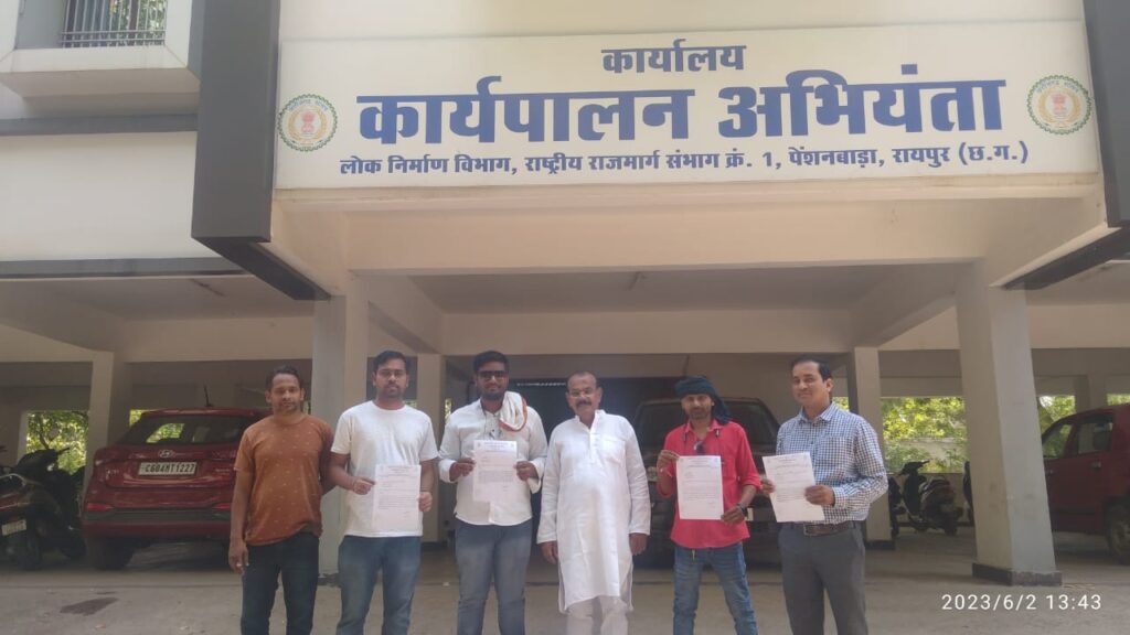 रायपुर/ आज दिनाक 02/06/2023 शुक्रवार को युवा कांग्रेस के रायपुर शहर जिलाउपाध्यक्ष महितोष साहू (रजत) के नेतृत्व में राष्ट्रीय राजमार्ग रिंग रोड नम्बर 1 के सर्विस रोड की नालियों की मरम्मत और सफाई के लिए राष्ट्रीय राजमार्ग के कार्यपालन अभियंता को ज्ञापन दिया गया।