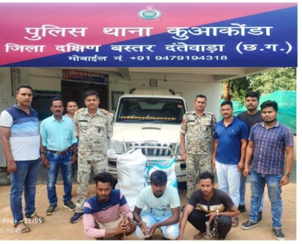 दन्तेवाड़ा पुलिस अधीक्षक गौरव राम प्रवेशराय अति० पुलिस अधीक्षक रामकुमार वर्मन के मार्गदर्शन में तथा पुलिस अनुविभागीय अधिकारी, कुआकोण्डा गोविंद दीवान के पर्यवेक्षण में मादक पदार्थों की तस्करी की रोकथाम हेतु चलाये जा रहे अभियान के तहत दिनांक 07.06.2023 को थाना कुआकोंडा पुलिस ने अवैध रूप से प्रतिबंधित मादक पदार्थ गांजा को ओडिशा राज्य के मलकानगिरी जिले से दन्तेवाड़ा – बीजापुर की ओर जाते हुए एक सफेद रंग का स्कॉर्पियो वाहन क्रमांक OD 30- 6059 में परिवहन करते हुए तीन व्यक्ति क्रमशः (1) उत्तम पोद्दार पिता नारायण पोद्दार उम्र 27 वर्ष जाति नमोशुद्ध साकिन एम. व्ही 94 पंचायत बदली थाना कालीमेला जिला मलकानगिरी (ओडिशा) (2) मिलन पडवी पिता मनामतो पडवी उम्र 20 वर्ष जाति रजवंशी साकिन एम. व्ही 94 पंचायत बदली थाना कालीमेला जिला मलकानगिरी (ओडिशा) (3) प्रसन्नजीत विश्वास पिता विश्वनाथ विश्वास उम्र 23 वर्ष जाति नमोशुद्र साकिन एम. व्ही 73 थाना कालीमेला जिला मलकानगिरी (ओडिशा) से मादक पदार्थ गांजा 70 पैकेटो में 61.500 किलोग्राम अनुमानित किमत बाजार मुल्य लगभग 9,22,500 /- रूपये, एवं स्कार्पियो वाहन किमती लगभग 400000 / रूपये के साथ गिरफ्तार करने में सफलता हासिल की है। इस कार्यवाही में थाना प्रभारी विजय पटेल, उप निरीक्षक कुमार चंदन, सउनि प्रहलाद निर्मल प्रधान आर 32 किशोर पटेल 95 अश्वन कुरैटी. आर कमांक 879 खेमराज जैन, आर 315 झिमटू राम, आर. 388 संजीव पवार, आर 59 श्यामलाल अट्टामी, आर 29 धन्नुर प्रदीप राव का विशेष सहयोग रहा।