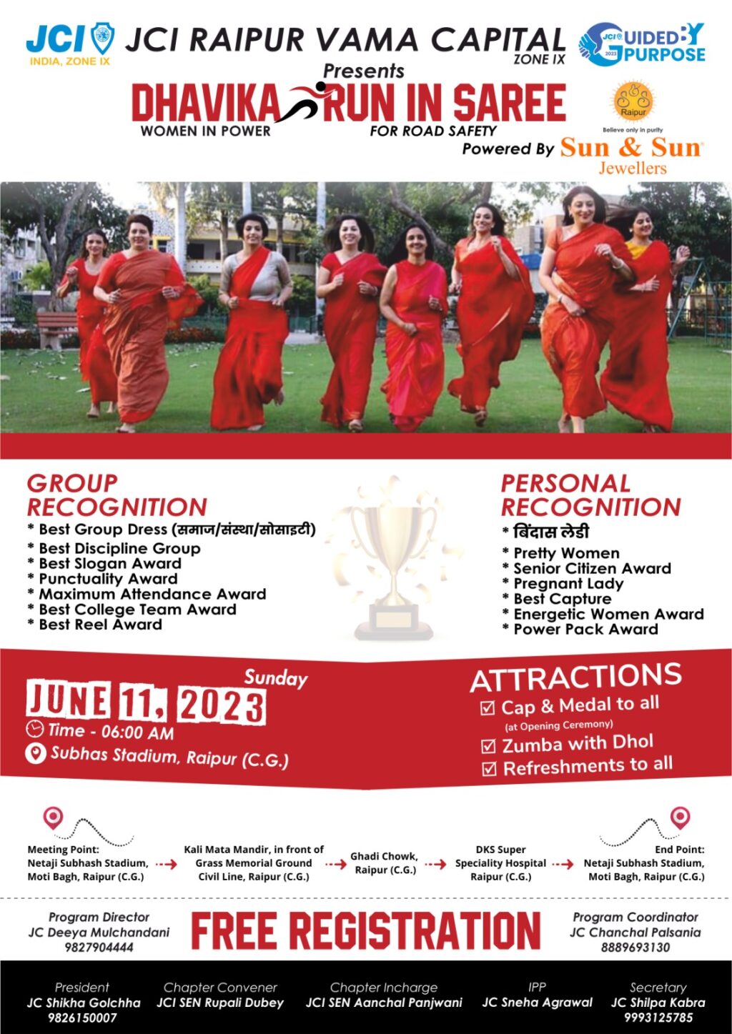 रायपुर वामा कैपिटल ने साडी मे..मैराथन दौड़ का आयोजन 11 जून को किया है। दौड़ रोड सेफ्टी के लिए और भारतीय परिधान होगा। कार्यक्रम कोऑर्डिनेटर चंचल पलसानिया, निर्देशक दिया मूलचंदानी , लीना वाढेर ,रूपाली दुबे, आंचल पंजवानी , शीतल उपाध्याय ,जया अरोरा ,स्नेहा अग्रवाल, संस्था की अध्यक्षा शिखा गोलछा ,सचिव शिल्पा काबरा सभी के सोच साकार नतीजा धाविका रन वो भी साडी मे.. भारतीय पारंपरिक परिधान में दौड़ नेताजी सुभाष स्टेडियम से प्रारंभ होकर काली मन्दिर, होते हुए डीके हॉस्पिटल से अपने तय समय में सुभाष स्टेडियम पहुंचेगी । मैराथन 11 जून सुबह 6:00 बजे स्टेडियम से प्रारंभ होगी