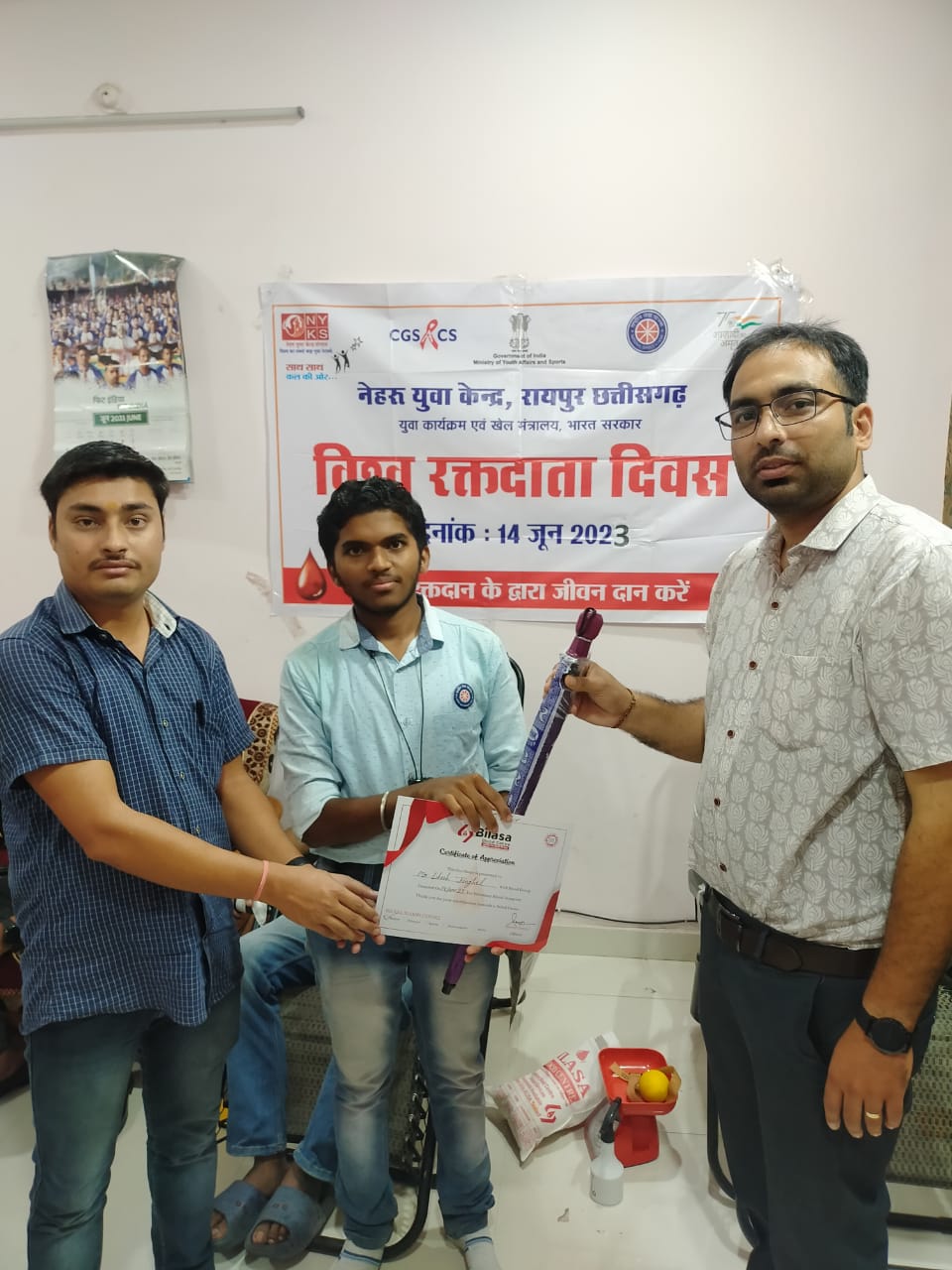 नेहरू युवा केन्द्र रायपुर छग, युवा कार्यक्रम एवं खेल मंत्रालय भारत सरकार द्वारा विश्व रक्तदाता दिवस के उपलक्ष्य पर रक्तदान शिविर का आयोजन नेहरू युवा केंद्र रायपुर के कार्यालय में किया गया। अर्पित तिवारी, जिला युवा अधिकारी, नेहरू युवा केंद्र रायपुर ने बताया की रक्त दान के माध्यम से लोगो को रक्त दान करने के लिए तथा स्वस्थ जीवन यापन करने के लिए प्रेरित करना है। उन्होंने बताया की 1 यूनिट रक्त दान करने से हम ३ ज़िन्दगी बचा सकते हैं । उक्त रक्त दान शिविर बिलासा ब्लड सेंटर के सहयोग से आयोजित किया गया जो की श्री रावतपुरा सरकार लोक कल्याण ट्रस्ट की एक शाखा है।