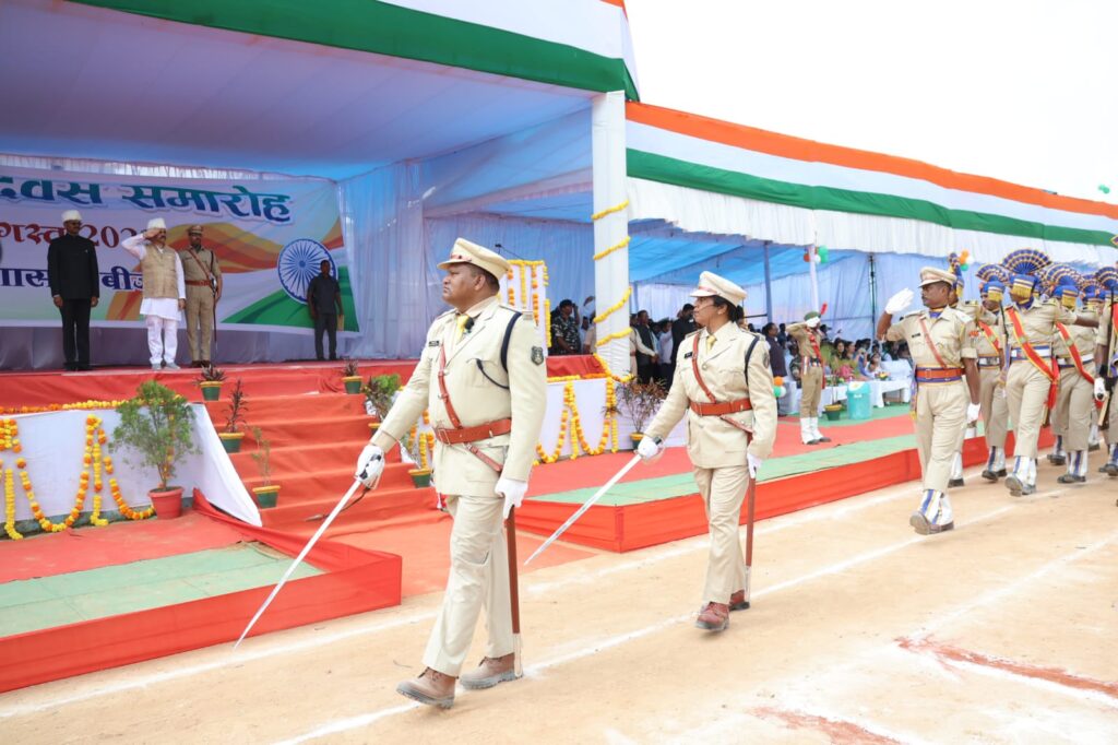 रायपुर, 15 अगस्त 2023/ स्वतंत्रता दिवस के 76वें वर्षगांठ के उपलक्ष्य में जिला मुख्यालय बीजापुर के मिनी स्टैडियम में मुख्य समारोह आयोजित किया गया। इस कार्यक्रम मे मुख्य अतिथि बस्तर विकास प्राधिकरण के उपाध्यक्ष व स्थानीय विधायक श्री विक्रम शाह मंडावी द्वारा ध्वजारोहण किया गया। इस मौके पर सीआरपीएफ, जिला पुलिस बल, छत्तीसगढ़ सशस्त्र बल, नगर सेना, एनसीसी, एनएसएस, स्काउट गाईड के 10 प्लाटून द्वारा गार्ड आफ ऑनर दिया गया। कार्यक्रम में राष्ट्रगान का गायन किया गया। इसके पश्चात् परेड द्वारा तिरंगे को सलामी दी गई। बस्तर विकास प्राधिकरण के उपाध्यक्ष व विधायक श्री विक्रम मंडावी द्वारा प्रदेश के मुख्यमंत्री श्री भूपेश बघेल का जनता के नाम संदेश का वाचन किया गया। इसके साथ ही हर्ष के प्रतीक रंग-बिरंगे गुब्बारे एवं शांति और प्रेम के प्रतीक कबूतर आसमान में छोड़े गये।
