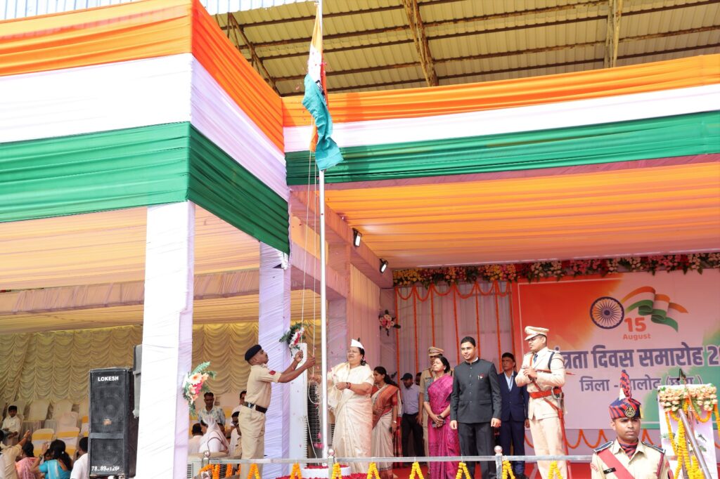 रायपुर, 15 अगस्त 2023/ देश का 77वां स्वतंत्रता दिवस बालोद जिले में हर्षोल्लास एवं गरिमामय ढंग से मनाया गया। जिला मुख्यालय के स्व. सरयू प्रसाद अग्रवाल स्टेडियम में आयोजित मुख्य समारोह में आज महिला एवं बाल विकास तथा समाज कल्याण मंत्री श्रीमती अनिला भेंड़िया ने राष्ट्रीय ध्वज फहराया और परेड की सलामी ली। उन्होंने मुख्यमंत्री श्री भूपेश बघेल का स्वतंत्रता दिवस संदेश का वाचन भी किया।