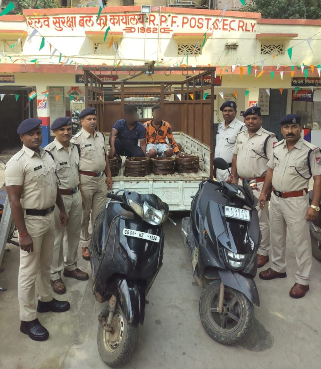 ट्रांसफार्मर से तांबा चोरी कर ले जाते हुए पुलिस ने आरोपको पकड़ा पुलिस ने बताया कि 25.08.2023 को रेलवे सुरक्षा बल पोस्ट रायपुर में सूचना प्राप्त हुई कि कुम्हारी-सरोना के मध्य स्थित रेलवे के पंप हाउस के सब स्टेशन में लगे रिजर्व ट्रांसफार्मर को अज्ञात चोरों द्वारा खेल दिया गया है तथा उसके अंदर का तांबा क्वाईल चोरी कर लिया गया है। सूचना पर तुरंत कार्यवाही करते हुए पोस्ट प्रभारी रायपुर अन्य अधिकारी व जवान के साथ घटना स्थल पर पहुंचकर मामले की जांच किए। रेलवे के विद्युत विभाग वरिश्ठ अनुभाग अभियंता के साथ चेक करने पर रेलवे के पंप हाउस के सब स्टेशन में लगा 500 KVH क्षमता वाले रिजर्व ट्रांसफार्मर से 20 नग कॉपर क्वाईल वजन 107.5 किलोग्राम तथा कीमत 35834/- को अज्ञात चोरों द्वारा चोरी करना पाया गया। रेलवे सुरक्षा बल पोस्ट रायपुर के प्रभारी द्वारा चोरित माल बरामदगी तथा संलिप्त आरोपियों की गिरफ्तारी हेतु अधिकारी व जवानों की अलग-अलग टीम बनाकर घटना के आसपास लगाया गया। घटना स्थल के आसपास के लोगों से लगातार पुछताछ की गई तथा घटना स्थल पर ही लगातार निगरानी की गई। जिसके दौरान दिनांक 25/26.08.2023 के मध्य रात्रि में मुखबीर की सूचना पर दो चोरों को 1) ईश्वर धू्रव पिता स्व. राम कुमार ध्रूव उम्र 19 वर्ष निवासी -ब्लॉक नंबर 15 रूम नंबर 09 बी.एस.यू.पी. कॉलोनी सरोना थाना डीडीनगर जिला रायपुर (छ.ग.) एवं 2) गुरूमेन्द्र कुढ़रिया पिता राम सगवन कुढ़रिया उम्र 36 वर्ष निवासी- सुभाषनगर देवार डेरा द्वारिका किराना स्टोर के पास वार्ड नं. 48 तेलीबांधा थाना तेलीबांधा जिला रायपुर (छ.ग.) को एक चार पहिया वाहन अशोक लिलेण्ड (पिकअप)एवं दो नग स्कूटी के साथ संपूर्ण चोरित संपत्ति 20 नग तांबा क्वाईल तथा एक टाई बार पट्टी लगभग 05 फिट लंबाई के साथ पकड़ा गया। जप्त सम्पत्ति की कुल कीमत 35934/- आंकी गई है। दोनों पकड़े गये आरोपियों व अन्य संलिप्त आरोपियों के विरूध्द रेलवे सुरक्षा बल पोस्ट रायपुर में अपराध क्रमांक 07/2023 दिनांक 26.08.2023 धारा 3 (ए) आर.पी. (यू.पी.) एक्ट का मामला दर्ज किया गया। दोनो आरोपियो को दिनांक 26.08.2023 को माननीय विशेष रेलवे न्यायालय रायपुर (छ.ग.) के समक्ष पेश किया गया जहां माननीय न्यायालय द्वारा आरोपियो को न्यायिक रिमाण्ड मे केन्द्रिय जेल रायपुर भेज दिया गया।