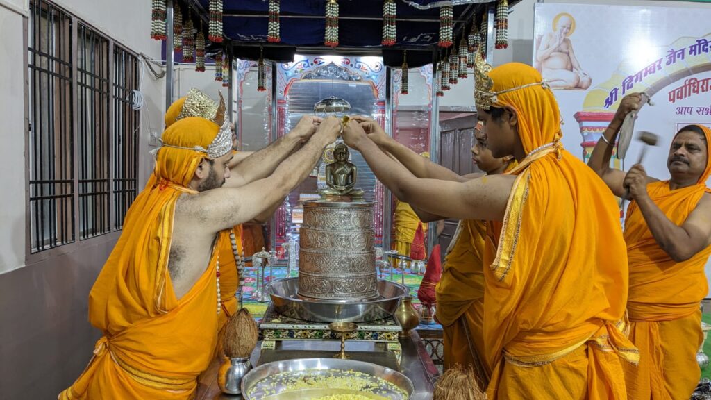 श्री आदिनाथ दिगम्बर जैन बड़ा मंदिर पंचायत ट्रस्ट मालवीय रोड मे पर्वाधिराज दसलक्षण पर्युषण महापर्व के अवसर पर आज तीसरे दिन 21 सितंबर 2023 भाद्रप्रद शुक्ल पक्ष तिथि छटमि वीर निर्वाण संमवत २५४९ गुरुवार के दिन उत्तम आर्जव दिवस मनाया गया ट्रस्ट कमेटी के अध्यक्ष संजय नायक एवं सचिव राजेश रज्जन जैन ने बताया की प्रतिदिन की तरह आज प्रातः 7 बजे 12 वे तीर्थंकर श्री वासुपूज्य भगवान का 4 स्वर्ण कलशो सें अभिषेक किया गया आज के सभी प्रथम इंद्र मुकेश जैन श्रुत जैन विवेक अर्पित जैन को अभिषेक का सौभाग्य प्राप्त हुआ रिद्धि सिद्धि शांति प्रदाता शांति धारा करने का सौभाग्य अमृत लाल गौरव जैन को प्राप्त हुआ तत्पश्चात श्री जी की आरती एवं सामूहिक पूजन किया गया
