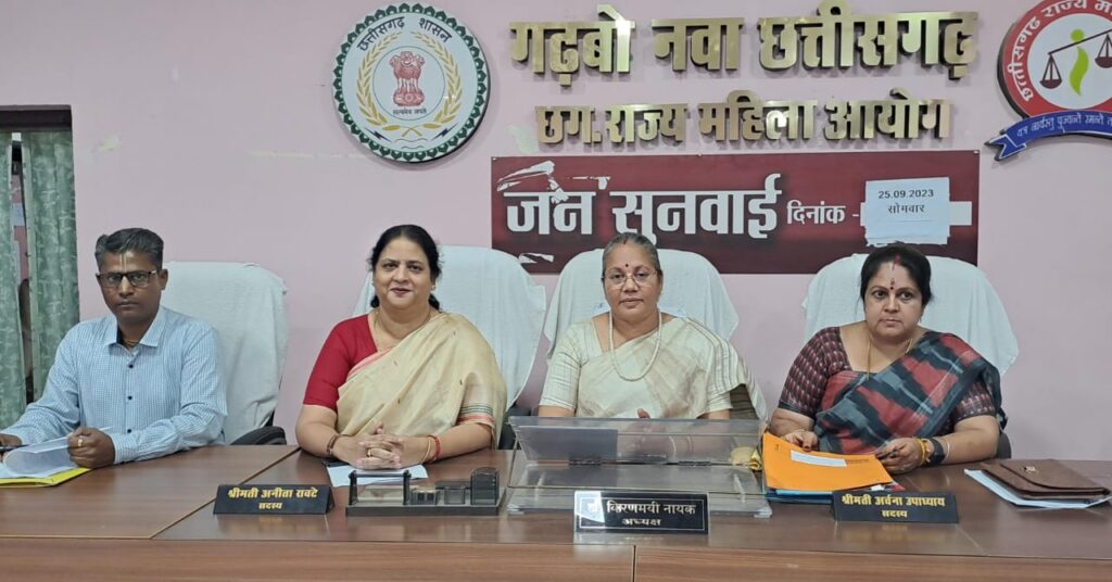 रायपुर / 25 सितंबर 2023 / छत्तीसगढ़ राज्य महिला आयोग की अध्यक्ष डॉ. किरणमयी नायक एवं सदस्य श्रीमती अर्चना उपाध्याय व डॉ. अनिता सवटे ने आज छत्तीसगढ़ राज्य महिला आयोग के कार्यालय रायपुर में महिला उत्पीड़न से संबंधित प्रकरणों पर सुनवाई की। आयोग की अध्यक्ष डॉ. किरणमयी नायक की अध्यक्षता में आज 226 वी व जिला स्तर पर 105 वीं सुनवाई हुई। रायपुर जिले में आयोजित जनसुनवाई में कुल 25 प्रकरण में सुनवाई की गई।