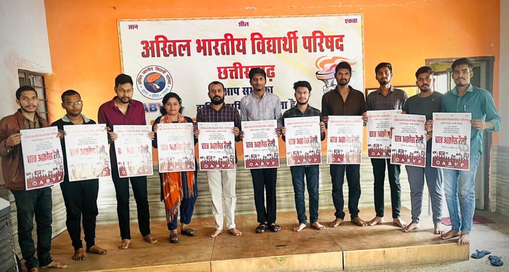 *रायपुर।* अखिल भारतीय विद्यार्थी परिषद् आगामी 6 अक्टूबर को पीएससी घोटाले के साथ-साथ प्रदेश की लगातार बिगड़ रही कानून व्यवस्था को लेकर एक विशाल प्रदेश स्तरीय आन्दोलन करने जा रही है। इस निमित्त आज यहां परिषद् के देवेन्द्र नगर स्थित प्रान्त कार्यालय में ‘छात्र आक्रोश रैली’ के पोस्टर का विमोचन किया गया, जिसमें प्रदेश मंत्री श्री मनोज वैष्णव विशेष रूप से उपस्थित रहे।