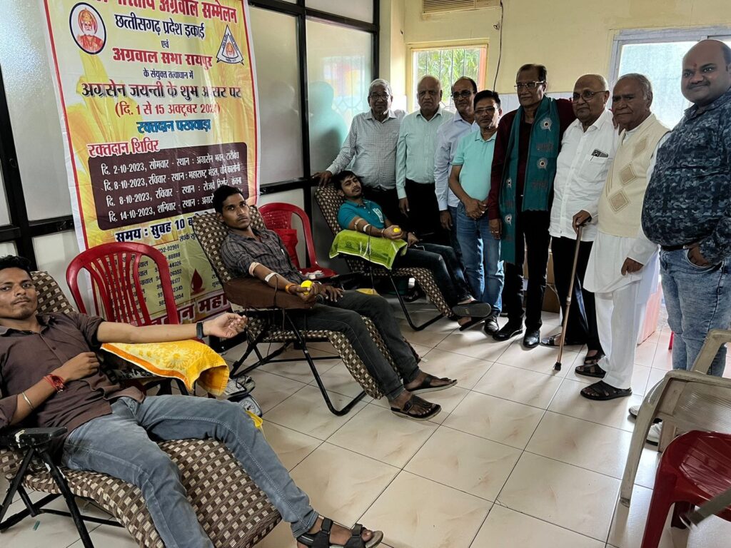 अखिल भारतीय अग्रवाल सम्मेलन छत्तीसगढ़ इकाई, अग्रवाल सभा रायपुर, एमएमआई हॉस्पिटल रायपुर, एवं टाटीबंध मोहल्ला समिति के संयुक्त तत्वाधान में रक्तदान शिविर का आयोजन किया गया। सम्मेलन के राष्ट्रीय वरिष्ठ उपाध्यक्ष ईश्वर प्रसाद अग्रवाल एवं राष्ट्रीय मंत्री परमानंद जैन ने बताया कि पूरे भारत में सम्मेलन द्वारा अग्रसेन जयंती के शुभ अवसर पर रक्तदान पखवाड़ा के रूप में मनाया जा रहा है जिसके तहत छत्तीसगढ़ में पूरे प्रदेश में 50 से अधिक एवं रायपुर संभाग में 16 स्थान पर रक्तदान शिविर का आयोजन किया जा रहा है जिसमें प्रथम बिल्हा में 49 यूनिट एवं रायपुर टाटीबंध में 42 यूनिट रक्तदान किया गया