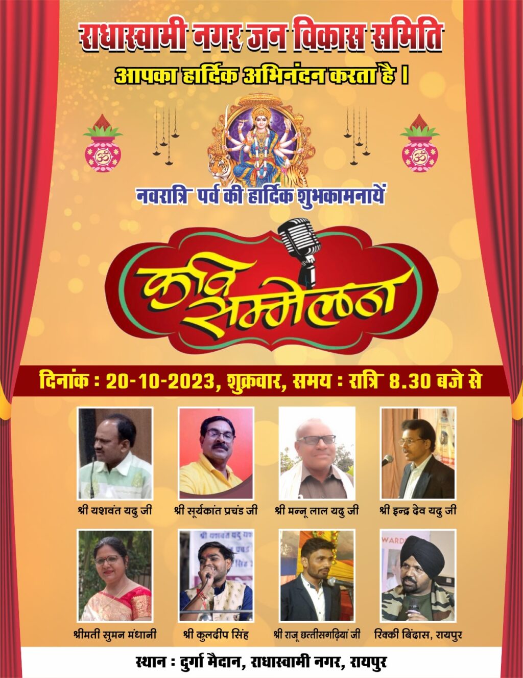 रायपुर । राधा स्वामी नगर जन विकास समिति के द्वारा नवरात्रि पर्व के अवसर पर दुर्गा मैदान राधा स्वामी नगर मेंआज 20 अक्टूबर को रात्रि 8:30 बजे से कवि सम्मेलन का आयोजन किया जा रहा है जिसमें प्रमुख कवि यशवंत यदु सूर्यकांत प्रचंड मन्नू लाल यदु , इंद्रदेव यदु, श्रीमती सुमन मंधानी ,कुलदीप सिंह ,राजू छत्तीसगढ़िया एवं रिंकी बिंदास शामिल है। जो अपने शब्दों की वाणी से लोगों को हंसी की फुहारें छोड़ने को मजबूर कर देगें।