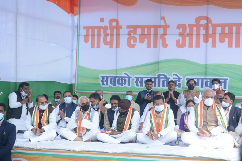 रायपुर। शहर जिला कांगे्रस कमेटी द्वारा गांधी हमारे अभिमान नामक कार्यक्रम आयोजित किया गया। यह कार्यक्रम कांगे्रस भवन स्थित गांधी मैदान मे किया गया था। जिसमे मुख्यरूप से मुख्यमंत्री भूपेश बघेल प्रदेश कांगे्रस कमेटी के अध्यक्ष मोहन मरकाम रविंद्र चैबे कवासी लखमा अमरजीत भगत सांसद छाया वर्मा विकास उपाध्याय सहित विधायकगण उपस्थित थे। कार्यक्रम के शुरूआत मे गांधी के छायाचित्र पर माल्यार्पण किया गया।तत्पशचात गांधी की भजनो की प्रस्तुति दी गयी।मंच पर गांधी की वेश भूषा मे बच्चे रघुपति राघव राजा राम का भजन कर रहे थे।