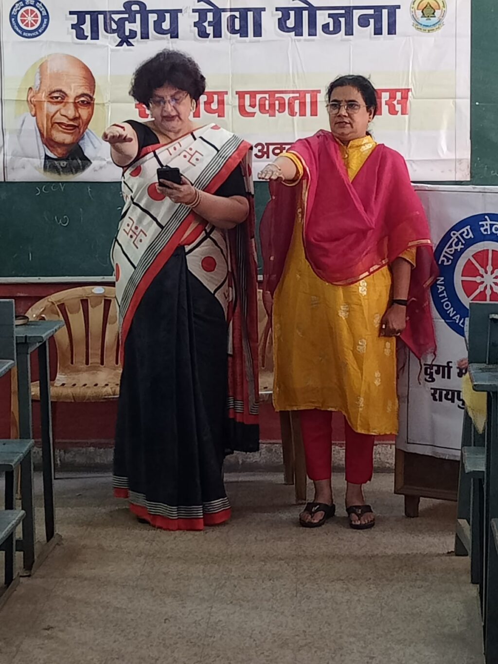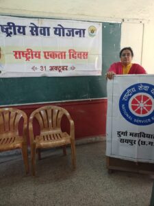 दुर्गा महाविद्यालय में आज भारत रत्न से सम्मानित लोह पुरुष सरदार वल्लभभाई पटेल की जयंती राष्ट्रीय एकता दिवस के रूप में मनाई गई कार्यक्रम में प्राचार्य डॉ प्रतिभा मुखर्जी साहूकार ने विद्यार्थियों को बताया कि कि वह भारत के पहले उप प्रधानमंत्री और गृहमंत्री भी थे उन्हें लोह पुरुष के रूप में जाना जाता है राष्ट्रीय सेवा योजना की कार्यक्रम अधिकारी सुनीता चांसोरिया ने बताया कि 31 अक्टूबर को राष्ट्रीय एकता दिवस के रूप में मनाया जाता है सरदार पटेल के विचार विद्यार्थियों के समक्ष रखें इसके पश्चात विद्यार्थियों ने स्लोगन के माध्यम से अपनी बात कही अनेकता में एकता ही हमारी शान है, इसलिए तो हमारा भारत महान है lमेरा ना कोई मजहब है ,ना कोई जाति का नाम है, हिंदुस्तान में रहता हूं ,राष्ट्रीय एकता ही मेरी पहचान है l