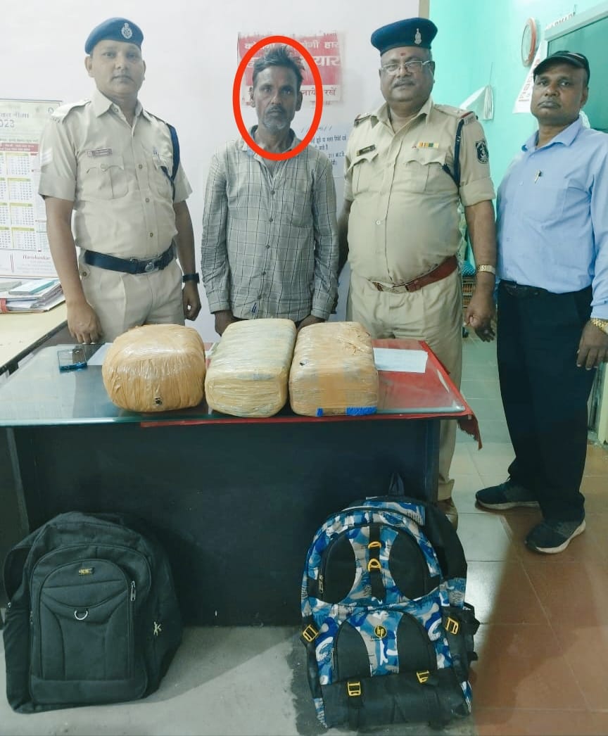 रायपुर ।मंडल टास्क टीम एवं आरपीएफ पोस्ट रायपुर एवम् एसआईबी रायपुर और गंज थाना रायपुर के साथ संयुक्तरूप से सघन चेकिंग के दौरान,आचार संहिता के दौरान चुनाव के मद्देनजर नशे के सौदागरों के विरूद्ध चलाये जा रहे अभियान *”ऑपरेशन नारकोस”* के तहत मुखबीर की सूचना के आधार पर रेसुब पोस्ट रायपुर प्रभारी एम.के.मुखर्जी , निरीक्षक एस.के. यादव एसआईबी के नेतृत्व में , प्र.आ. व्ही. सी. बंजारे, व आ.ए के ध्रुव एसआईबी व गंज थाना के अधिकारी व हमराह स्टाफ की संयुक्त टीम द्वारा आपरेशन नारकोस के तहत मुखबिर सूचना के आधार पर रेलवे स्टेशन रायपुर के एंट्री गेट, गुरुद्वारा के सामने मुखबिर के बताए हुलिया पहनावा एवम सामान के आधार पर एक संदिग्ध व्यक्ति को घेरा बंदी कर पकड़ा गया, उसके पास रखे दो पिठ्ठू बैग को चेक करने पर उनमें मादक पदार्थ गांजा होना पाया गया, नाम पता पूछने पर अपना नाम – भीमा नाईक, पिता श्री धर नाईक, उम्र 53 वर्ष, निवासी ग्राम बिजिरगुड़ा, थाना नवरंगपुर जिला नवरंगपुर (ओडिशा) का रहने वाला बताया । पिठ्ठू बैगों को चेक करने पर कुल 03 पैकेट गांजा होना पाया ,जिसका कुल वजन 15 किलो ,300 ग्राम ,मादक पदार्थ गांजा पाया गया, जिसका कीमती लगभग 3,06000/ (तीन लाख छै: हजार रुपया) , एवम दो नग मोबाइल एक टच स्क्रीन, एक सैमसंग कंपनी का की पैड दोनो का कीमत 5800/ रुपया *कुल मशरुका 3,11800/ रुपया (तीन लाख ग्यारह हजार आठ सौ रुपया मात्र*)का पाया गया उक्त आरोपी को एनडीपीएस एक्ट के तहत् विधिवत कार्यवाही कर गिरफ्तार किया गया।
