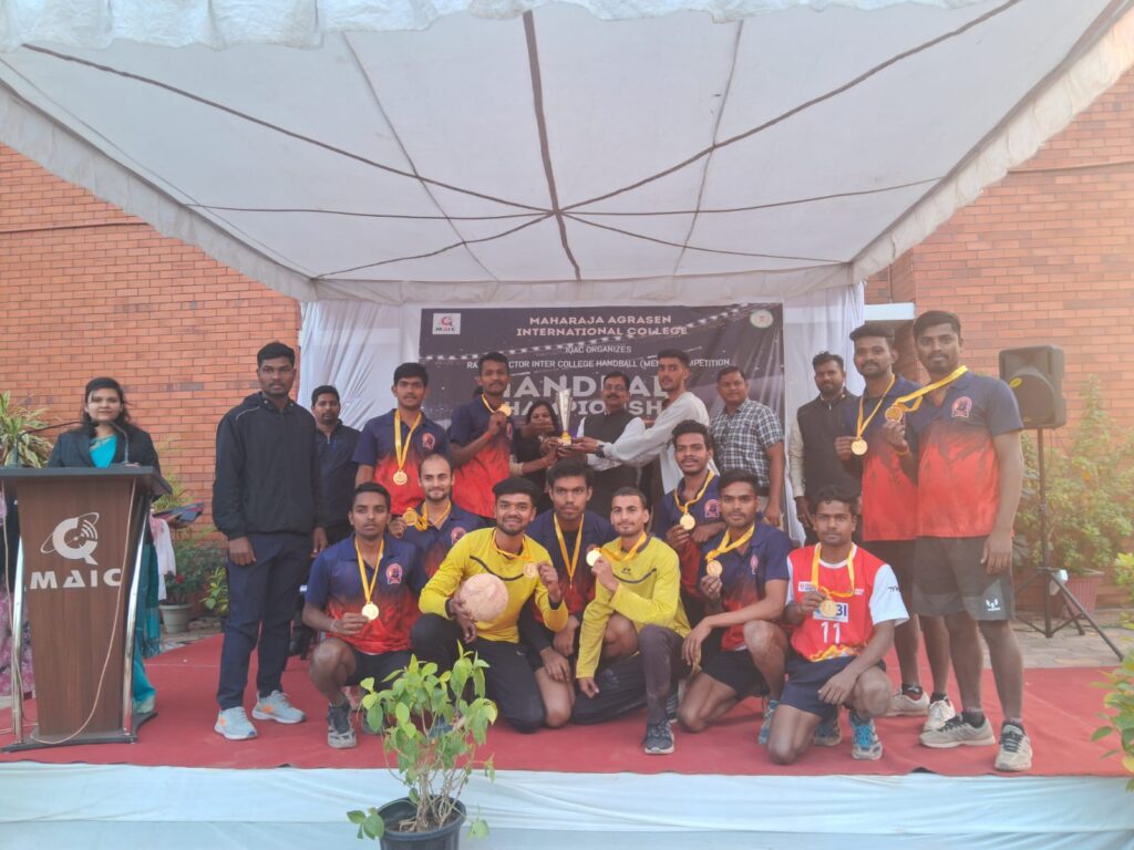 महाराजा अग्रसेन इंटरनेशनल कॉलेज समता कॉलोनी रायपुर में, दिनाँक 19/12/2023 को सेक्टर अंतर महाविद्यालय हैण्डबॉल (पुरुष) प्रतियोगिता का आयोजन किया गया। जिसमें पं. रविशंकर शुक्ल विश्वविद्यालय से संबधित महाविद्यालयों के प्रतिभागी शामिल हुए। विप्र महाविद्यालय रायपुर, यू.टी.डी. रायपुर, शासकीय विज्ञान महाविद्यालय रायपुर, नेताजी महाविद्यालय अभनपुर तथा शासकीय महाविद्यालय आरंग महाविद्यालयों के प्रतिभागी प्रतियोगिता में शामिल हुए।