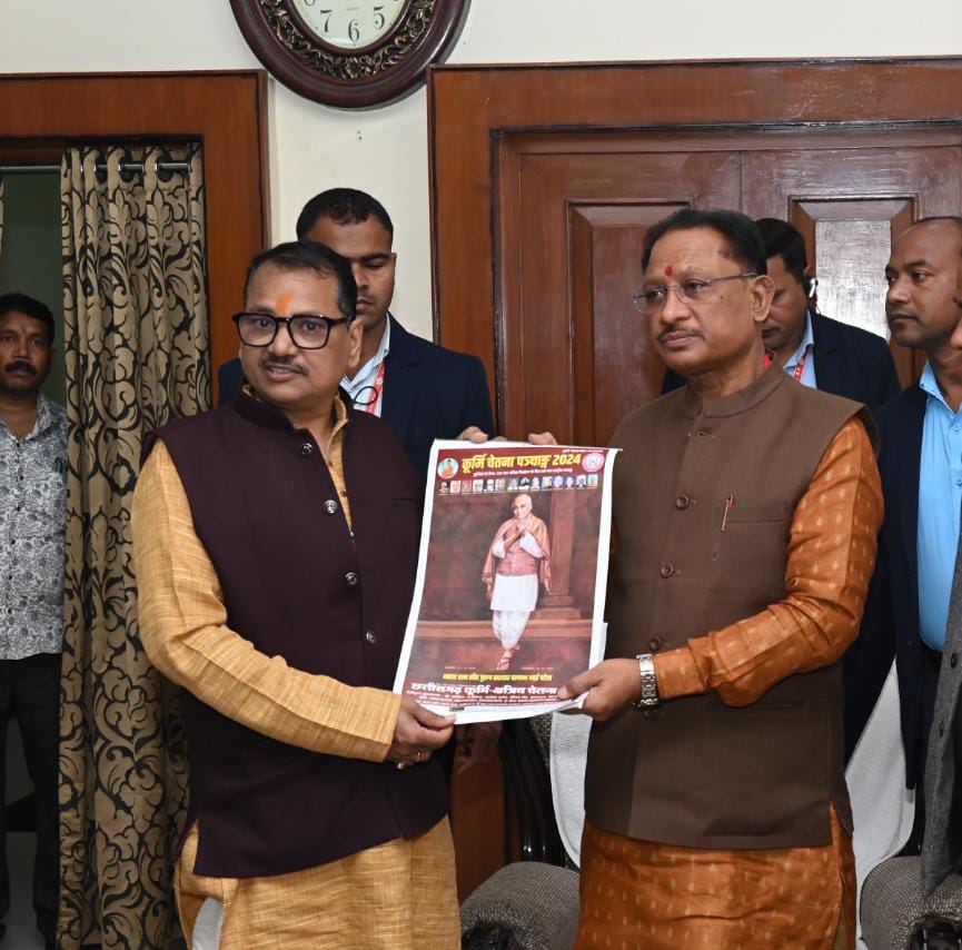 रायपुर 25 दिसंबर 2023/मुख्यमंत्री विष्णु देव साय ने आज राज्य अतिथि गृह पहुना में छत्तीसगढ़ कुर्मी क्षत्रिय चेतना मंच द्वारा प्रकाशित कैलेण्डर का विमोचन किया।मुख्यमंत्री ने विमोचन के बाद प्रकाशित कैलेंडर के लिए समाज के लोगो को बधाई दी।इस दौरान समाज के प्रदेश सचिव ऋषि कश्यप के साथ अन्य पदाधिकारी उपस्थित थे।