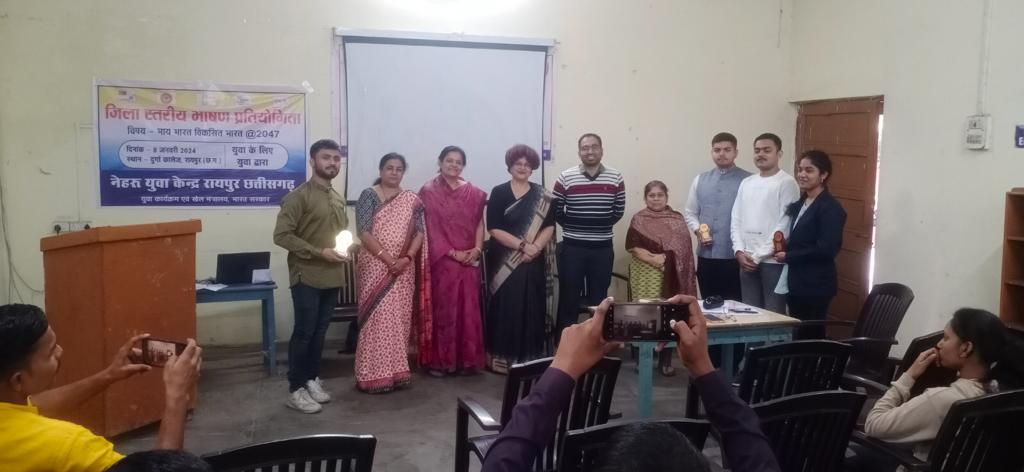 नेहरू युवा केंद्र रायपुर, युवा कार्यक्रम एवं खेल मंत्रालय, भारत सरकार, द्वारा भाषण प्रतियोगिता का आयोजन दुर्गा कॉलेज, रायपुर मे 08.01.2023 को आयोजित किया। इस भाषण प्रतियोगिता का विषय माय भारत – विकसित भारत@2047 था। प्रतियोगिता का मुख्य उदेश्य युवा की देश निर्माण मे भागीदारी सुनिश्चित करना है। इस प्रतियोगिता मे 35 से अधिक युवाओं ने पूरे जिले से भाग लिया। देवशीश पटेल को प्रथम स्थान, रश्मि वर्मा को द्वितीय स्थान व तृतीय स्थान श्रीचार्य मिश्र व अभिषेक जैसवाल को प्राप्त हुआ।