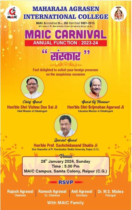 महाराजा अग्रसेन इंटरनेशनल कॉलेज (मैक), समता कॉलोनी रायपुर में 28/01/2024 (रविवार) को वार्षिक उत्सव ‘‘मैक कार्निवाल का आयोजन किया जा रहा है। इस वर्ष वार्षिक उत्सव का आगाज ‘‘संस्कार’’ के ज्ीमउम पर आयोजित किया जाएगा। कार्यक्रम में प्रमुख रूप से प्रदेश के शिक्षा मंत्री माननीय श्री बृजमोहन अग्रवाल जी एवं माननीय प्रो. सच्चिदानंद शुक्ला जी, कुलपति, पं. रविशंकर शुक्ल विश्वविद्यालय रायपुर उपस्थित रहेंगे। कार्यक्रम में महाविद्यालय के चेयरमैन आदरणीय श्री राजेश अग्रवाल जी, पूर्व चेयरमैन आदरणीय श्री रमेश अग्रवाल जी एवं प्राचार्य डॉ.एम. एस. मिश्रा तथा समस्त ट्रस्टीगण विशेष रूप से उपस्थित होंगे।