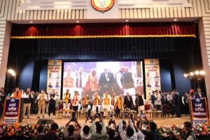 कार्यक्रम के मुख्य अतिथि माननीय मुख्यमंत्री श्री विष्णुदेव साय जी तथा विशिष्ट अतिथिगण उप मुख्यमंत्री माननीय श्री अरुण साव जी, माननीय श्री विजय शर्मा जी, केबिनेट मंत्री माननीय श्री बृजमोहन अग्रवाल जी, माननीय श्री दयालदास बघेल जी, विधायक माननीय श्री पुरंदर मिश्रा जी के आगमन पश्चात् अतिथियों द्वारा दीप प्रज्वलन कर अभिनंदन समारोह का विधिवत शुभारम्भ किया गया।