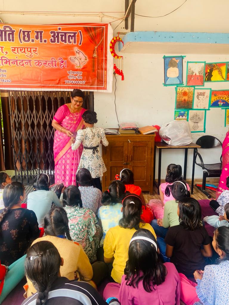श्री दिगंबर जैन महासमिति महिला विंग रायपुर द्वारा 28/1/2024 दिन रविवार को राजधानी रायपुर के खम्हारडीह में स्थित शासकीय बालिका गृह में रह रही बालिकाओं को कपड़े लोवर ,टी-शर्ट , के साथ खाद्य सामग्री नमकीन के पैकेट एवं तिल्ली लड्डू वितरित किए तथा वहा रह रही बालिकाओं के साथ मनोजरंक विभिन्न गेम भी खेल कर तरह तरह को प्रतिस्पर्धाएं भी आयोजित की गई जिसमे प्रथम ,द्वितीय ,तृतीय आने वाली बालिकाओं को पुरस्कार भी दिया गया ।इस कार्यक्रम में श्री दिगंबर जैन महासमिति महिला विंग की समिति अध्यक्ष श्रीमती संध्या जैन कोषाअध्यक्ष श्रीमती दीप्ति जैन एवम् सदस्य अलका ,रश्मि ,रेखा ,नेहा विधा सौम्या रूपाली जैन उपस्थित थी बालिका गृह की संचालिका श्रीमती पूजा अग्रवाल भी उपस्थित थी उनके द्वारा इस कार्यक्रम में भरपूर सहयोग हमे प्राप्त हुआ