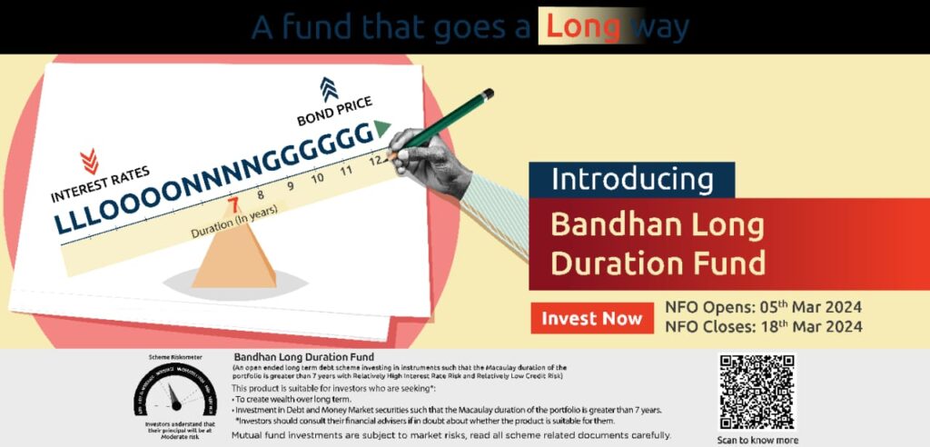 रायपुर,बंधन म्यूचुअल फंड ने बंधन लन्ग ड्यूरेशन फंड के लन्च की घोषणा की जो एक ओपन-एंडेड लन्गटर्म डेट प्लान है जो ऐसे इंस्ट्रूमेंट्स में निवेश करती है जिनकी पोर्टफोलियो मैकाले अवधि 7 वर्ष से अधिक होगी। यह फंड उन निवेशकों के लिए एक आकर्षक अवसर प्रदान कर सकता है जो अर्थव्यवस्था में संरचनात्मक सुधारों के कारण मौजूदा निकट-चरम ब्याज दरों में गिरावट की उम्मीद कर रहे हैं। फंड के लिए नया फंड अफर मंगलवार, 5 मार्च 2024 को खुलने वाला है और सोमवार, 18 मार्च 2024 को बंद होगा। बंधन लन्ग ड्यूरेशन फंड में निवेश लाइसेंस प्राप्त म्यूचुअल फंड वितरकों और निवेश सलाहकारों के माध्यम से अनलाइन प्लेटफर्म पर भी किया जा सकता है।