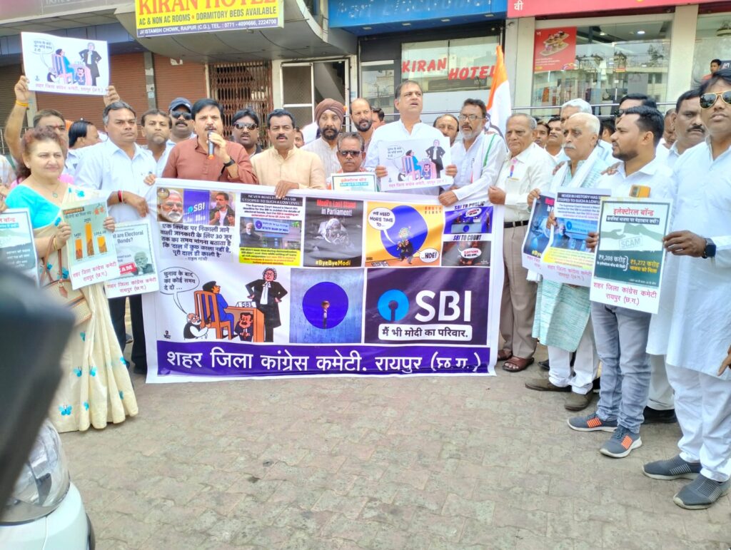 रायपुर/07 मार्च 2024। चुनावी बांड में भाजपा के घोटाले तथा इस घोटाले की पर्दादारी के लिये भारतीय स्टेट बैंक के मिलीभगत के खिलाफ कांग्रेस ने आज प्रदेश के सभी जिलों में स्टेट बैंकों के सामने विरोध प्रदर्शन किया।