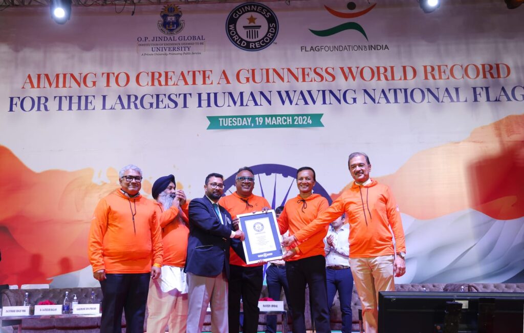 इस आयोजन को प्रमाणित करने के लिए गिनीज वर्ल्ड रिकॉर्ड्स के निर्णायक, श्री ऋषि नाथ परिसर में उपस्थित थे और इस अवसर पर उन्होंने कहा, “इस बात की घोषणा करते हुए मुझे बेहद खुशी हो रही है कि, ओ.पी. जिंदल ग्लोबल यूनिवर्सिटी ने फ्लैग फाउंडेशन ऑफ इंडिया के सहयोग से 7368 उत्साही प्रतिभागियों के साथ सबसे बड़ा मानव झंडा लहराने का रिकॉर्ड बनाने में सफलता प्राप्त की है। अब यह रिकॉर्ड JGU और FFI के नाम है, और मुझे प्रसन्नता है कि उनके इस प्रयास के बाद यह नया रिकॉर्ड आधिकारिक गिनीज बुक ऑफ वर्ल्ड रिकॉर्ड्स का हिस्सा होगा।”