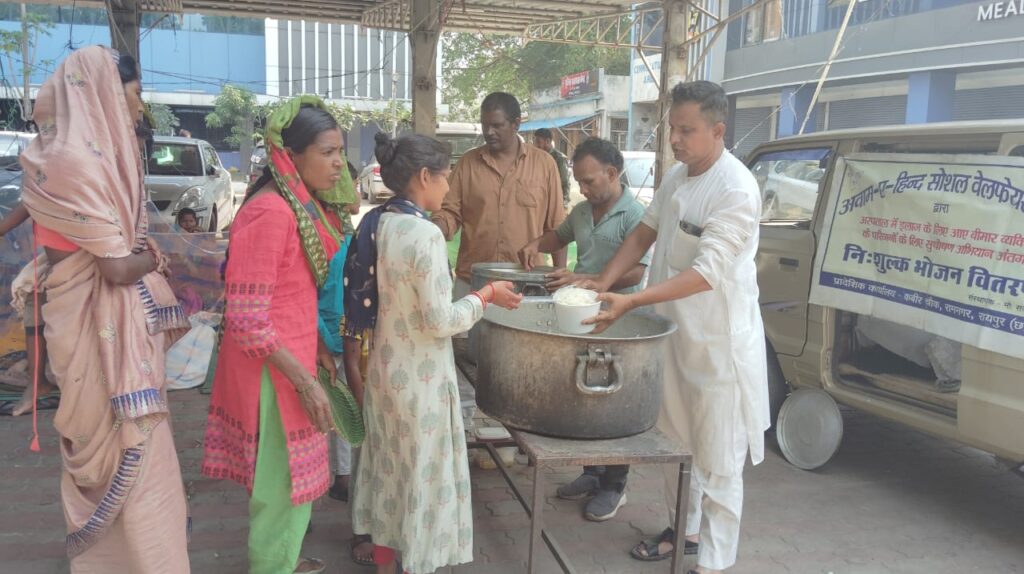संस्था अवाम-ए-हिन्द सोशल वेलफेयर कमेटी के तत्वावधान में चलाये जा रहे सुपोषण अभियान के तहत स्थानीय शासकीय डी.के.एस अस्पताल, रायपुर में छत्तीसगढ़ अंचल एवं दीगर अन्य प्रांतों से इलाज कराने कराने आए मरीजों तथा उनके परिजनों तथा शहर के विभिन्न क्षेत्र, फुटपाथ में एकाकी जीवन व्यतीत करने वाले असहाय, लाचार, जरूरतमंदों को निःशुल्क भोजन सेवा कार्य के आज 1458वां दिन पूर्ण करते हुए नियमित रूप से दोनों वक्त निःशुल्क भोजन वितरण की व्यवस्था कर अपनी सेवाएं देते चली आ रही है।