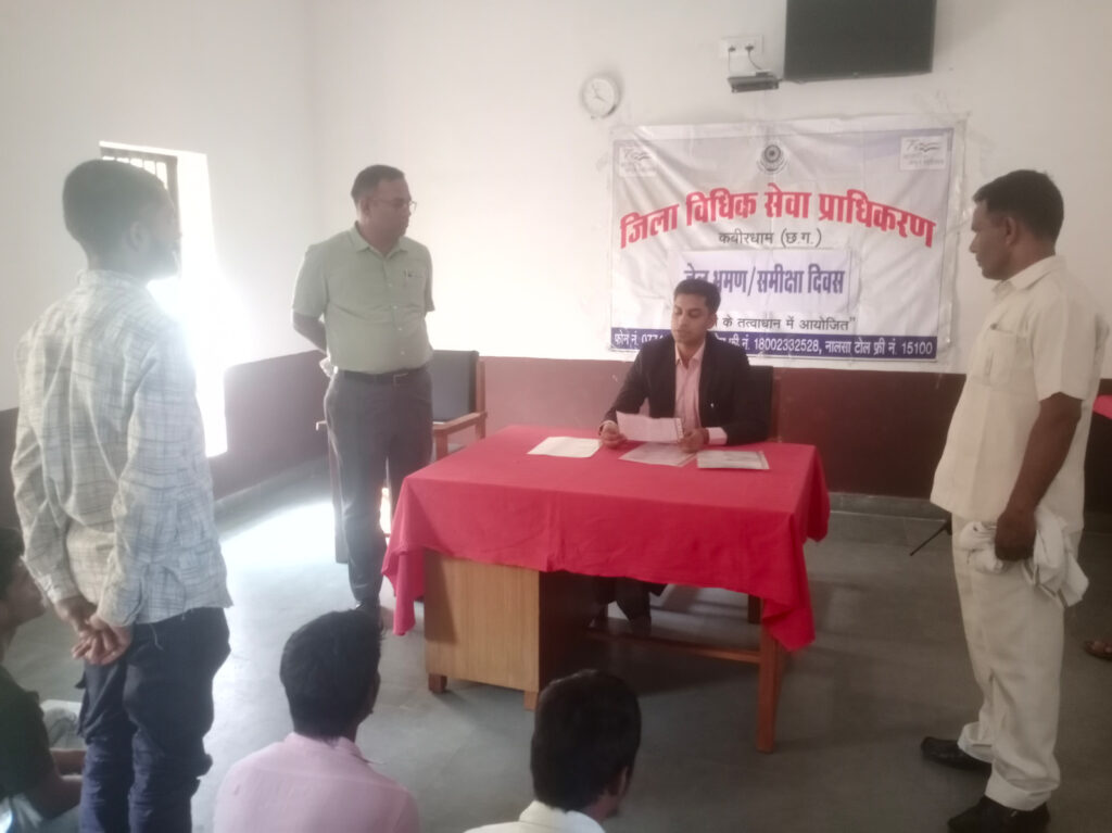 जिला विधिक सेवा प्राधिकरण के सचिव श्री राहुल कुमार ने बंदियों को उनके अधिकारों के बारे में बताते हुए जमानत, पैरोल, अभिवाक चर्चा (प्लीबार्गेनिंग) का लाभ उठाने हेतु उन्हें प्रेरित किया गया। साथ ही विधिक सेवा प्राधिकरण कबीरधाम के द्वारा विधिक सहायता एवं सलाह योजना का लाभ उठाने के लिए उन्हें प्रोत्साहित किया गया जिसमें उन्हें अपने सिविल एवं क्रिमिनल मुकदमों के लिए प्राधिकरण से निःशुल्क अधिवक्ता प्राप्त करने की पात्रता, जेल बंदियों को होने की बात कही। यह व्यवस्था निम्न न्यायालयों से लेकर उच्चतम न्यायालय तक उपलब्ध होने की बात भी उन्हें बतायी गयी। जिला जेल कबीरधाम में कुल 233 बंदी है, जिन्हें उक्त शिविर में विधिक जानकारी दी गई। प्राधिकरण सचिव श्री राहुल कुमार द्वारा जेल में बंद रिमाण्ड स्तर के 5 बंदियों को निःशुल्क अधिवक्ता प्रदान करने के निर्देश जेल अधीक्षक एवं उपस्थित पीएलव्ही को दिए। इस अवसर पर जेल अधीक्षक श्री राजेन्द्र कुमार बंजारे, जेल प्रहरी एवं पैरालीगल वालिन्टियर श्री योगेन्द्र सिंह गहरवार उपस्थित थे।