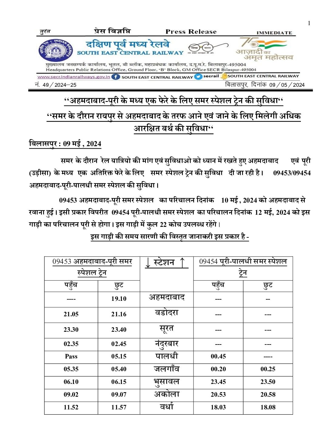 रायपुर /बिलासपुर : 09 मई , 2024समर के दौरान रेल यात्रियो की मांग एवं सुविधाओ को ध्यान में रखते हुए अहमदाबाद एवं पूरी (उड़ीसा) के मध्य एक अतिरिक्त फेरे के लिए समर स्पेशल ट्रेन की सुविधा दी जा रही है । 09453/09454 अहमदाबाद-पूरी-पालधी समर स्पेशल की सुविधा ।