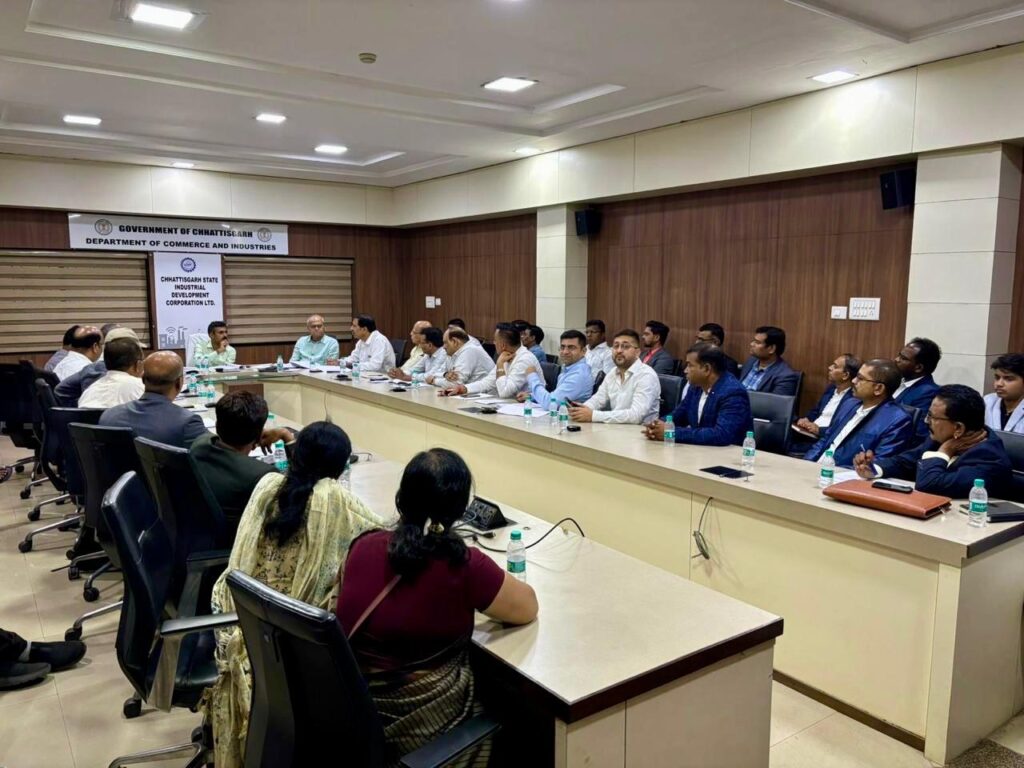 छत्तीसगढ़ चेम्बर ऑफ कॉमर्स एंड इंडस्ट्रीज के प्रदेश अध्यक्ष अमर पारवानी, महामंत्री अजय भसीन, कोषाध्यक्ष उत्तमचंद गोलछा, कार्यकारी अध्यक्ष राजेन्द्र जग्गी,विक्रम सिंहदेव, राम मंधान, मनमोहन अग्रवाल ने बताया कि बुधवार, दिनांक 22 मई 2024 को उद्योग भवन, तेलीबांधा, रायपुर में श्री अंकित आनंद जी (आई.ए.एस.), सचिव, वाणिज्य एवं उद्योग विभाग की अध्यक्षता में प्रस्तावित नई औद्योगिक नीति 2024-29 के लिए प्रदेश के उद्योग क्षेत्र के समग्र विकास हेतु चेम्बर पदाधिकारियों एवं अन्य विभिन्न औद्योगिक संस्थाओं की बैठक आयोजित हुई। उक्त बैठक में श्री आलोक त्रिवेदी, संयुक्त सचिव वाणिज्य एवं उद्योग विभाग और अतिरिक्त निदेशक उद्योग निदेशालय छत्तीसगढ़ शासन, श्री प्रवीण शुक्ला अपर निदेशक एसआईपीबी (राज्य निवेश संवर्धन बोर्ड),श्री अनिल श्रीवास्तव कार्यकारी निदेशक, सीएसआईडीसी, श्री संजय गजघाटे संयुक्त निदेशक उद्योग निदेशालय छत्तीसगढ़ शासन उपस्थित रहे।