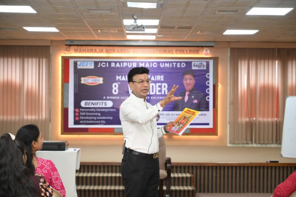 रायपुर, 25 मई 2024 – महाराजा अग्रसेन इंटरनेशनल कॉलेज (मैक) ने 25 मई को 18 वर्ष और उससे अधिक उम्र की महिलाओं और लड़कियों के लिए आत्म-संवर्धन, व्यक्तित्व विकास और नेतृत्व गुणों पर केंद्रित एक विशेष प्रशिक्षण सत्र का सफलतापूर्वक आयोजन किया। मैक सोलिटेयर कार्यक्रम का यह विशिष्ट आयोजन प्रसिद्ध अंतर्राष्ट्रीय प्राइम ट्रेनर, पीपीपी जेएफआर जेसीआई सेन. श्री राजेश अग्रवाल द्वारा संचालित किया गया।