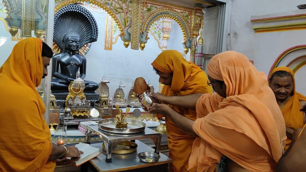 श्री आदिनाथ दिगंबर जैन बड़ा मंदिर मालवीय रोड रायपुर के जिनालय में पार्श्वनाथ बेदी के समक्ष आध्यात्मिक प्रयोगशाला के माध्यम से आज दिनाँक – ३१/०५/२०२४ तिथि : ज्येष्ठ कृष्ण अष्टमी/नवमी, निर्माण संवत २५५० दिन : शुक्रवार को अष्टमी तिथि होने के कारण विशेष धार्मिक आयोजन किया जाता है। जिसमे सर्वप्रथम आज जिनप्रतिमाओ का अभिषेक शांति धारा पूजन अर्घ्य समर्पित किए गए। जिनालय के पूर्व उपाध्यक्ष श्रेयश जैन बालू ने बताया की प्रतिदिन की तरह आज दिनांक 31 मई 2024 रविवार को प्रात 8.30 बजे श्रावक गण सामुहिक रूप से एकत्रित होकर जिनालय की पार्श्वनाथ बेदी में भगवान पुष्पदंत भगवान को पांडुक शिला में विराजमान किया। मंगलाष्टक पाठ प्रारंभ कर 4 रजत कलशों में शुद्ध प्रासुक जल भरकर श्री जी का समता भाव पूर्वक अभिषेक किया। आज रिद्धि सिद्धि सुख शांति प्रदाता शांतिधारा भी की गई जिसे करने का सौभाग्य पलक जैन(बाबूलाल टाकीज) को प्राप्त हुआ। आज की शांति धारा का शुद्ध उच्चारण लोकेश जैन द्वारा किया गया। शांतिधारा पश्चात सभी ने श्री जी की आरती भक्ति भाव से की विनय पाठ पढ़ सभी ने अभिषेक के दौरान उच्चारित मंत्रों से भक्ति और जिनबिम्ब के स्पर्श से पवित्र गन्धोदक को अपने संचित पापों को क्षय करने की उत्तम भावना से नेत्र और ललाट पर धारण किया। तत्पश्चात अष्ट द्रव्य से सामुहिक पूजा में सर्वप्रथम नवदेवता पूजन एवं भगवान पुष्पदंत भगवान की पूजन कर अष्ट द्रव्य से निर्मित अर्घ्य समर्पित किए । अंत में विसर्जन पाठ पढ़ कर पूजन विसर्जन किया गया।
