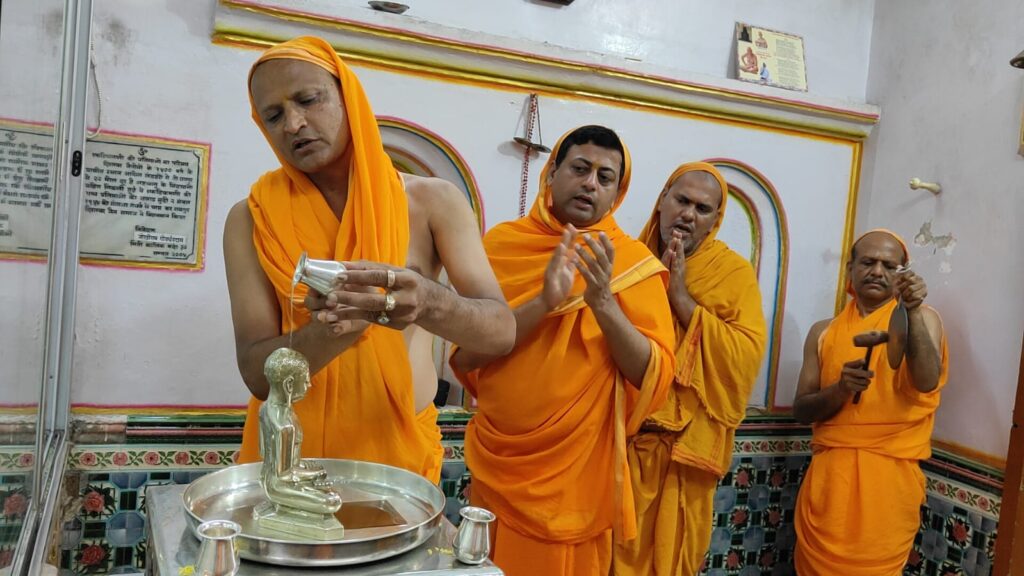 12 वे तीर्थंकर भगवान वासुपूज्य का गर्भ कल्याणक महोत्सव के अवसर पर आज दिनांक 27 जून आषाढ़ कृष्ण षष्ठी गुरुवार को राजधानी रायपुर शहर के आदिनाथ दिगंबर जैन बड़ा मंदिर के जिनालय में पार्श्वनाथ बेदी के समक्ष हर्षोल्लास एवं भक्तिभाव के साथ धार्मिक वातावरण में मनाया गया। बड़ा मंदिर के पूर्व उपाध्यक्ष श्रेयश जैन बालू ने बताया की आज इस अवसर पर जिनालय के पार्श्वनाथ बेदी के समक्ष धर्म प्रेमी बंधुओ द्वारा सुबह 8 बजे वासुपुज्य भगवान को मंत्रोचार के साथ पांडुक्षिला में विराजमान किया गया। सभी उपस्थित सदस्यो ने प्रासुक जल से भगवान का मंत्रोचार के साथ अभिषेक एवं विशेष शांति धारा की। आज की रिद्धि सिद्धि सुख शांति प्रदाता शांति धारा करने का सौभाग्य पूर्व सचिव राजेश रज्जन जैन को प्राप्त हुआ। शांति धारा का वाचन राशु जैन द्वारा किया गया। तत्पश्चात सभी ने भगवान की भक्तिभाव से भगवान की आरती कर वासुपुज्य भगवान का विशेष पूजन प्रारंभ किया। अष्ट द्रव्यों से पूजन कर जयकारों की गूंज के बीच श्री वासुपूज्य पूजन के अर्घ्य समर्पित किए गए। अंत में ॐ ह्रीं श्रीवासुपूज्य जिनेन्द्राय पूर्णार्घ्यं निर्वपामीति स्वाहा मंत्र उच्चारण से अंतिम अर्घ्य चढ़ा कर विसर्जन किया गया। इस अवसर पर आज विशेष रूप से श्रेयश जैन बालू,राजेश रज्जन जैन, शैलेंद्र जैन, राशु जैन,प्रवीण जैन,जितेंद्र जैन जित्तू,प्रणीत जैन,श्रद्धेय जैन विक्की, नीरज जैन के साथ बड़ी संख्या में महिलाए उपस्थित थी।