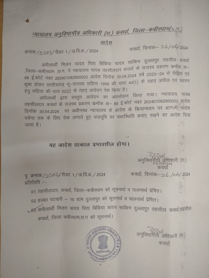 कवर्धा एसडीएम न्यायालय द्वारा तहसील न्यायालय में दर्ज अतिक्रमण प्रकरण पर स्टे लगाया गया