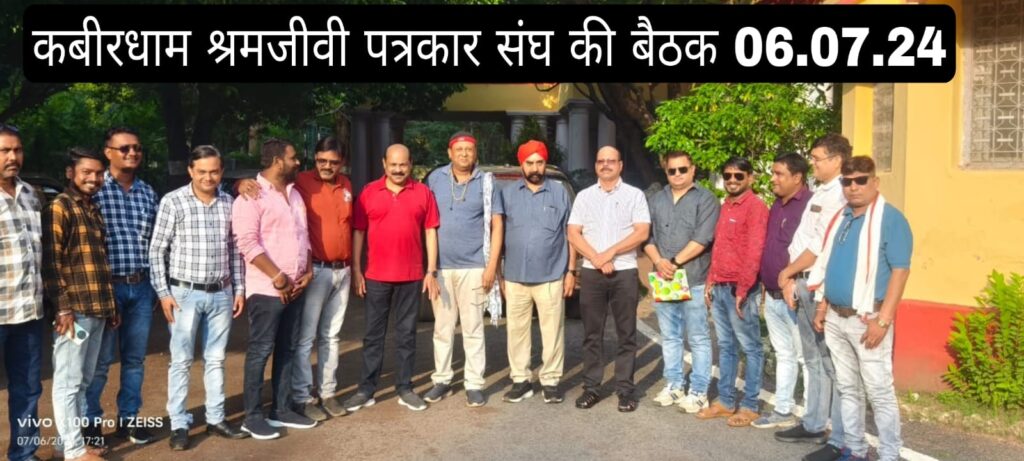कवर्धा कबीरधाम जिला इकाई की आवश्यक बैठक 06 जुलाई को कवर्धा के रेस्ट हाउस में आयोजित की गई थी ,जिसमे प्रदेश से आए पदाधिकारी आदरणीय छगन साहू और उनके साथ विवेक वैष्णव बालोद पूर्व अध्यक्ष की उपस्थिति रही कवर्धा कबीरधाम के लोकप्रिय जिलाध्यक्ष श्री अभिताब नामदेव के अध्यक्षता में मीटिंग आयोजित की गई जिसमें प्रदेश सचिव पंडरिया से निर्मल सलूजा प्रदेश सचिव की भी उपस्तिथि रही।और डाक्टर मिर्जा संभाग अध्यक्ष राजनादगांव सहित जिले के महासचिव पद्मराज ठाकुर ,उपाध्यक्ष आदिल खान ,बोड़ला ब्लाक अध्यक्ष बोड़ला जीवन साहू ब्लाक अध्यक्ष कवर्धा ब्रजेश गुप्ता, शहर अध्यक्ष सूर्या गुप्ता ,जिला पदाधिकारी बसंत नामदेव सहित अन्य पदाधिकारी और सदस्यों की गरिमामई उपस्थिति रही बैठक में सर्वप्रथम छगन साहू ने सभी साथियों को हरियाली में सभी को वृक्षारोपण हेतु आवश्यक कदम बताते हुए सभी को करने और उसकी संरक्षण करने की बात कही। जिसके बाद उन्होंने बताया कि पत्रकार संघ द्वारा कवर्धा जिले में मुख्यमंत्री का कार्यक्रम करवाने का हमारा तय था , और है। क्युकी श्रमजीवी संघ का पूरे प्रदेश भर में और अन्य प्रदेश तक में एक बड़ा विशाल समूह है। जल्द ही बड़ा कार्यक्रम की रूपरेखा पर चर्चा हुई।