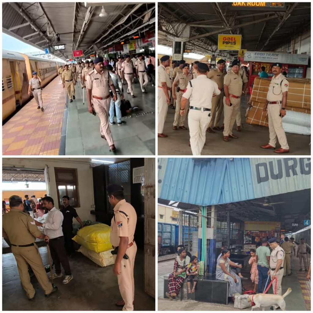 दुर्ग ।रेलवे स्टेशन दुर्ग में लोकल पुलिस ASP शुखनंदन राठौर, DSP सी पी तिवारी, CSP सत्यप्रकाश तिवारी, मोहन नगर थाना TI मोनिका पांडे तथा दुर्ग आरपीएफ पोस्ट निरीक्षक एस के सिन्हा ,जीआरपी चौकी प्रभारी अपने अधिकारी व स्टाफ के साथ संदिग्ध व्यक्तियों तथा वस्तुओ की सुरक्षात्मक चेकिंग प्लेटफार्म न 1 से 6, पार्सल तथा ट्रेन में BDDS व स्वान दस्ता के साथ सुरक्षात्मक चेकिंग किया गया।