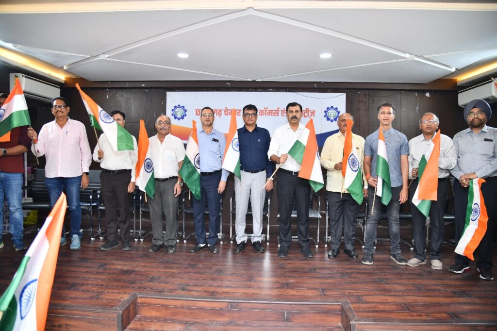छत्तीसगढ़ चेम्बर ऑफ कॉमर्स एंड इंडस्ट्रीज के प्रदेश अध्यक्ष अमर पारवानी, महामंत्री अजय भसीन, कोषाध्यक्ष उत्तमचंद गोलछा, कार्यकारी अध्यक्ष राजेन्द्र जग्गी,विक्रम सिंहदेव, राम मंधान, मनमोहन अग्रवाल ने बताया कि आज दिनांक 13 जनवरी 2024 को चेम्बर भवन में आजादी के अमृत महोत्सव के उपलक्ष पर देश के लिए अपना सर्वस्व अर्पण करने वाले वीर शहीद विभूतियों एवं स्वतंत्रता सेनानियों के सम्मान में हर घर तिरंगा हर दुकान तिरंगा कार्यक्रम का आयोजन किया गया जहां उपस्थित चेम्बर पदाधिकारीकरण एवं व्यापारी संगठनों के प्रमुख तथा व्यापारी गणों ने अपने घर एवं व्यापारिक प्रतिष्ठानों पर राष्ट्रीय प्रतीक तिरंगे झंडे को लगाने का प्रण लिया।