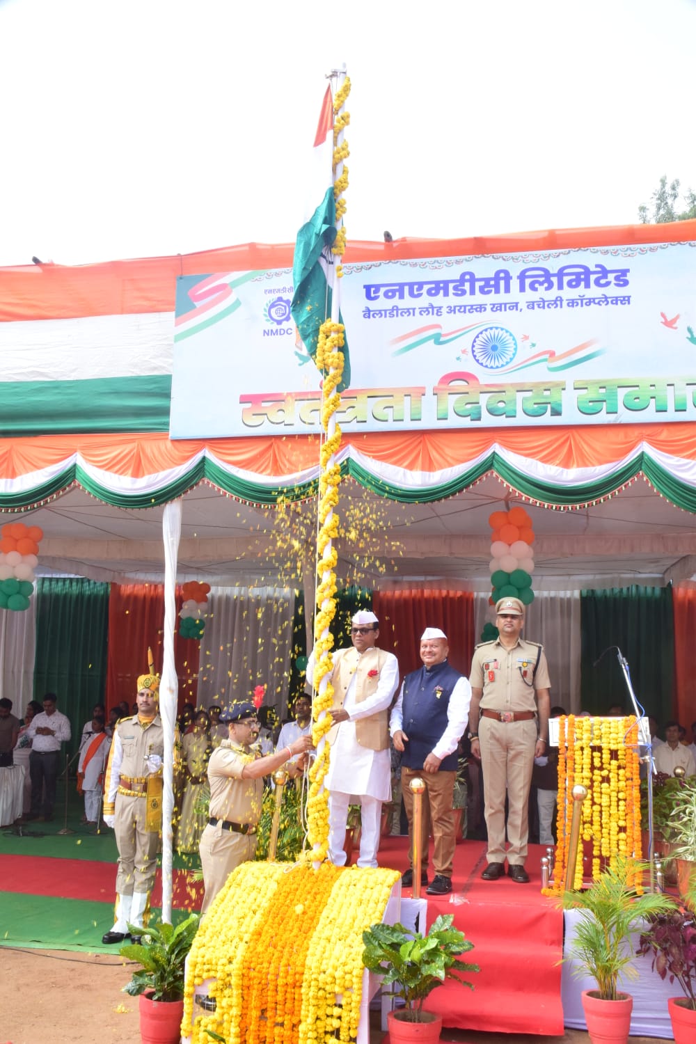 कार्यक्रम का आरंभ मुख्य अतिथि द्वारा ध्वजारोहण कर किया गया। तत्पश्चात मुख्य अतिथि ने स्वतंत्रता दिवस की बधाई अपने उद्बोधन में दी। कार्यक्रम के मुख्य अतिथि परियोजना प्रमुख श्री बी वेंकटेश्वरलु, अधिशासी निदेशक ने अपने संबोधन में स्वतंत्रता के महत्व को रेखांकित करते हुए वीर बलिदानियों के प्रति अपनी कृतज्ञता व्यक्त की। उन्होंने एनएमडीसी बचेली की श्रेष्ठ उपलब्धियों पर भी प्रकाश डाला।