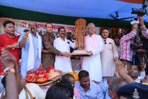 तत्पश्चात पूर्व मुख्यमंत्री श्री बघेल कांग्रेस जनों के द्वारा भजन मंडलियों के स्वागत हेतु बनाए गए मंच पर पहुंचे और प्रदेश के विभिन्न जिलों के अनेक कस्बों,नगरों से आई भजन मंडलियों का उत्साह वर्धन करते हुए उनका श्रीफल,भगवान की प्रतिमा और नकद राशि देकर उनका सम्मान किया।इस दौरान बघेल ने अनेक टोलियों से उनके गांव,खेती बाड़ी,फसल और बारिश के बारे में भी पूछताछ की। कांग्रेस के इस मंच पर विधायक इंद्र साव के अलावा,विकास उपाध्याय एवं काफी संख्या में वरिष्ठ कांग्रेसजन,पार्टी के पदाधिकारी गण मंच पर आसीन थे। मंच पर विधायक इंद्र साव ने प्रदेश के पूर्व मुखिया बघेल को कष्टकला से निर्मित भगवान श्री राम की प्रतिमा स्मृति चिन्ह के रूप में दी।