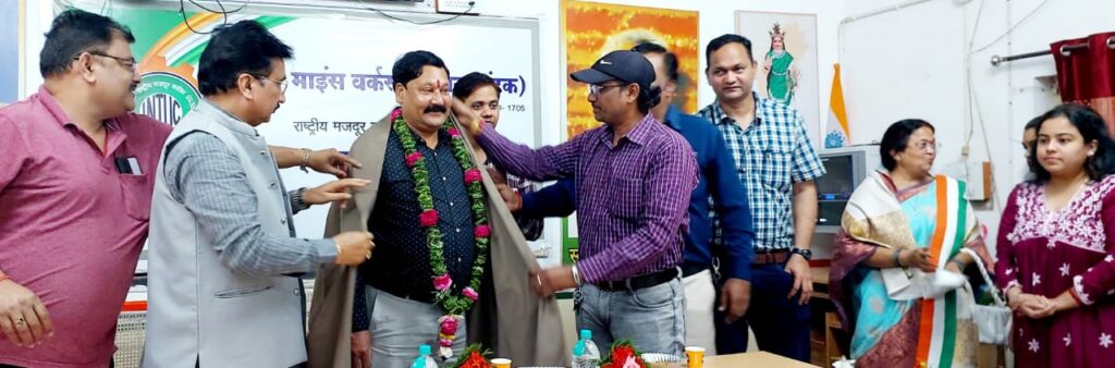एस एच अज़हर दंतेवाड़ा किरंदुल. मेटल माइन्स वर्कर्स यूनियन (इंटक) शाखा किरंदुल द्वारा परम्परानुसार किरंदुल परियोजना में दीर्घ अवधि तक सेवाएं देकर सेवानिवृत्त हुये वरिष्ठ सदस्य योगेश पिपरिया का स्मृति चिन्ह, शॉल, तिरंगा गमछा से एमएमडब्ल्यूयू शाखा किरंदुल के सचिव ए.के. सिंह, कार्यकारी अध्यक्ष चिन्नास्वामी द्वारा सम्मानित किया गया। इस अवसर पर पदाधिकारी एवं वरिष्ठ सदस्यों ॐ कुमार साहू, महेश सिन्हा, विजयेंद्र गिरी, अनिल साहू, एम के मल्लाह, सुमन कुलहारे द्वारा वरिष्ठ सदस्य के कार्यकाल के समय साथ बिताये गए पलों को याद करते हुए अपने अनुभव साझा किए तथा उनकी कर्मठता तथा अनुशासन, उनकी नियमित दिनचर्या, यूनियन और समाज के प्रति उनके समर्पण एवं योगदान से युवा साथियों को प्रेरणा लेने की बातें कही। मंच संचालन कार्यालय सचिव राजेन्द्र यादव द्वारा किया गया। इस अवसर पर नथेला राम नेताम, जी रवि, बी जी प्रदीप, पवन कुमार, शैलेश रथ, त्रिलोक बांधे, राकेश लाल, दिनेश साहू, टीकमचंद साहू, ओम प्रकाश साहू, प्यारेलाल साहू, दिलीप सिंह, राजेन्द्र नागेश, धनदीप सिंह, मनीष गुप्ता, मो यासीन, जीवन साहू सहित श्रम संघ के पदाधिकारी, कार्यकारिणी सदस्य एवं सदस्यगण उपस्थित थे।