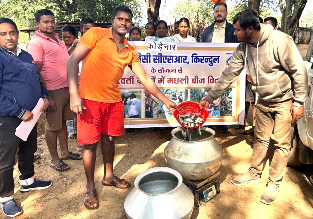 एस एच अजहर दंतेवाड़ा किरंदुल : एनएमडीसी लिमिटेड की महत्वपूर्ण परियोजना बीआईओएम कॉम्पलेक्स, किरंदुल के मुख्य महाप्रबंधक संजीव साही के निर्देशन एवं उप महाप्रबंधक (कार्मिक) बी.के. माधव के मार्गदर्शन में एनएमडीसी प्रबंधन नैगम सामाजिक दायित्व (सीएसआर) के तहत परियोजना के परिक्षेत्रीय विकास हेतु प्रतिबद्ध है। इसी के तहत एनएमडीसी प्रबंधन ने अपने आसपास के ग्रामवासियों के जीवन स्तर और जीवन यापन हेतु आदिवासी किसानों की मांग पर सीएसआर के अन्तर्गत मछली बीज वितरण ग्राम माहराहाउरनार, समलवार, अलनार, गुमियापाल, पिरनार, हिरोली, मदाड़ी/पेरपा, कोड़ेनार, पालनार, हितावर,गोंगपाल, कलेपाल एवं चोलनार के आदिवासी किसानों को किया गया। इस दौरान परियोजना प्रबंधन की ओर से विवेक कुमार रक्षा, प्रबंधक (सीएसआर) एवं एस.आर.गावडे,प्रबंधक (सिविल)/सीएसआर के साथ विभिन्न ग्राम के सरपंच व ग्रामवासी उपस्थित थे। परियोजना प्रबंधन द्वारा स्वरोजगार अवसर प्रदान करने के इस सराहनीय व प्रशंसनीय कार्यों का स्थानीय आदिवासियों ने भूरि-भूरि प्रशंसा की।